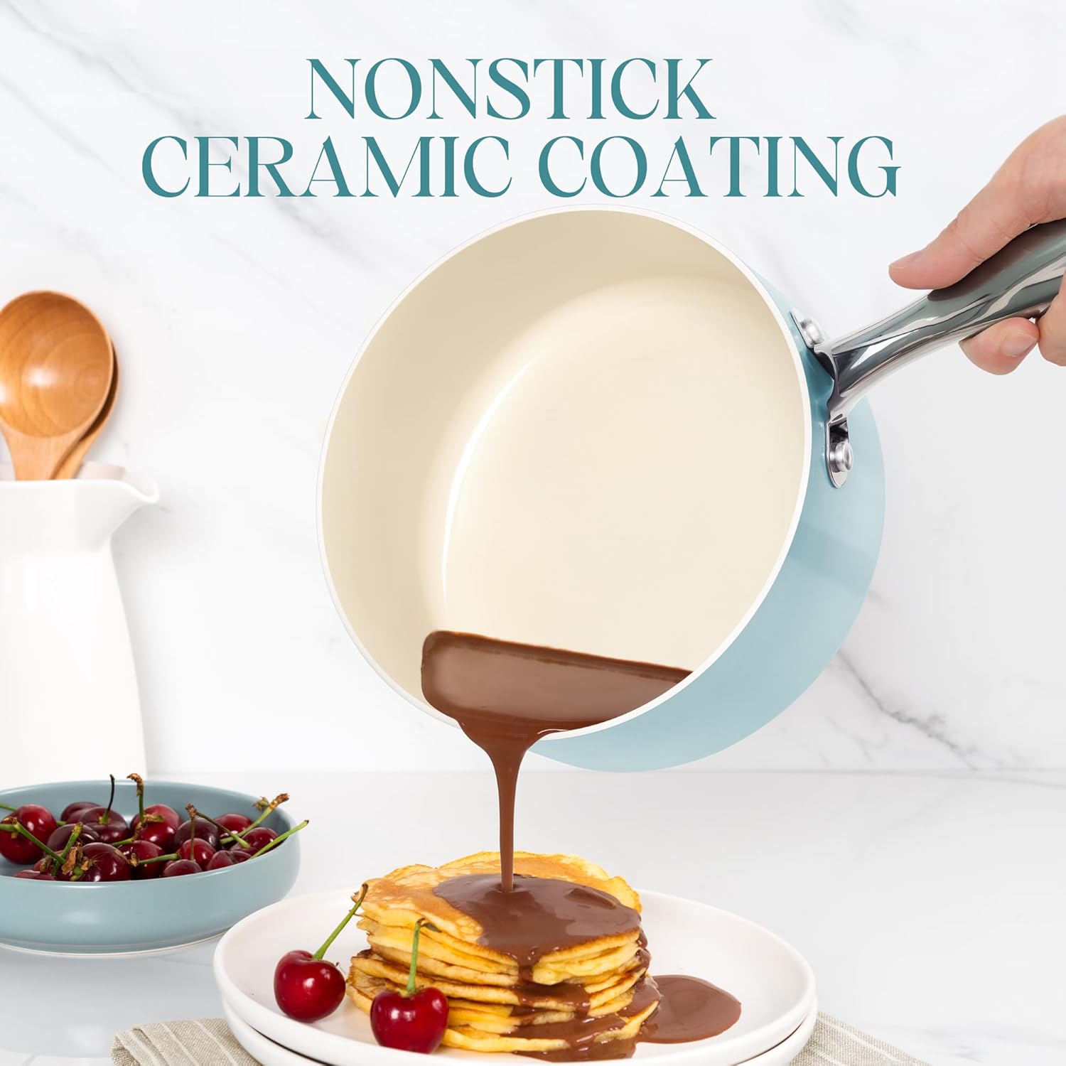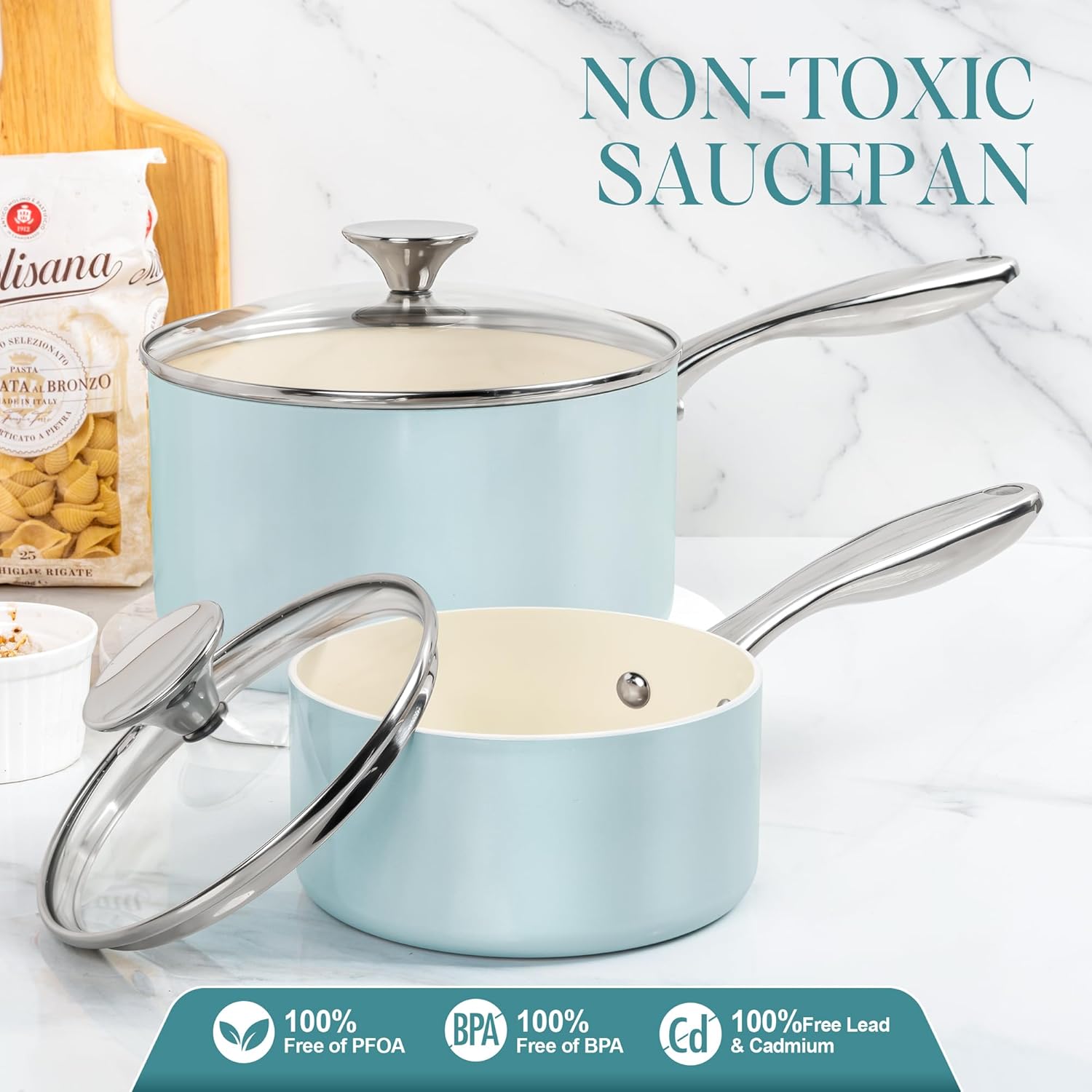 MICHELANGELO 3 Quart Saucepan with Lid - Non Toxic Sauce Pan with Nonstick Ceramic Coating, Scratch-Resistant, Induction Saucepan Suitable for All Stovetops, Light Blue