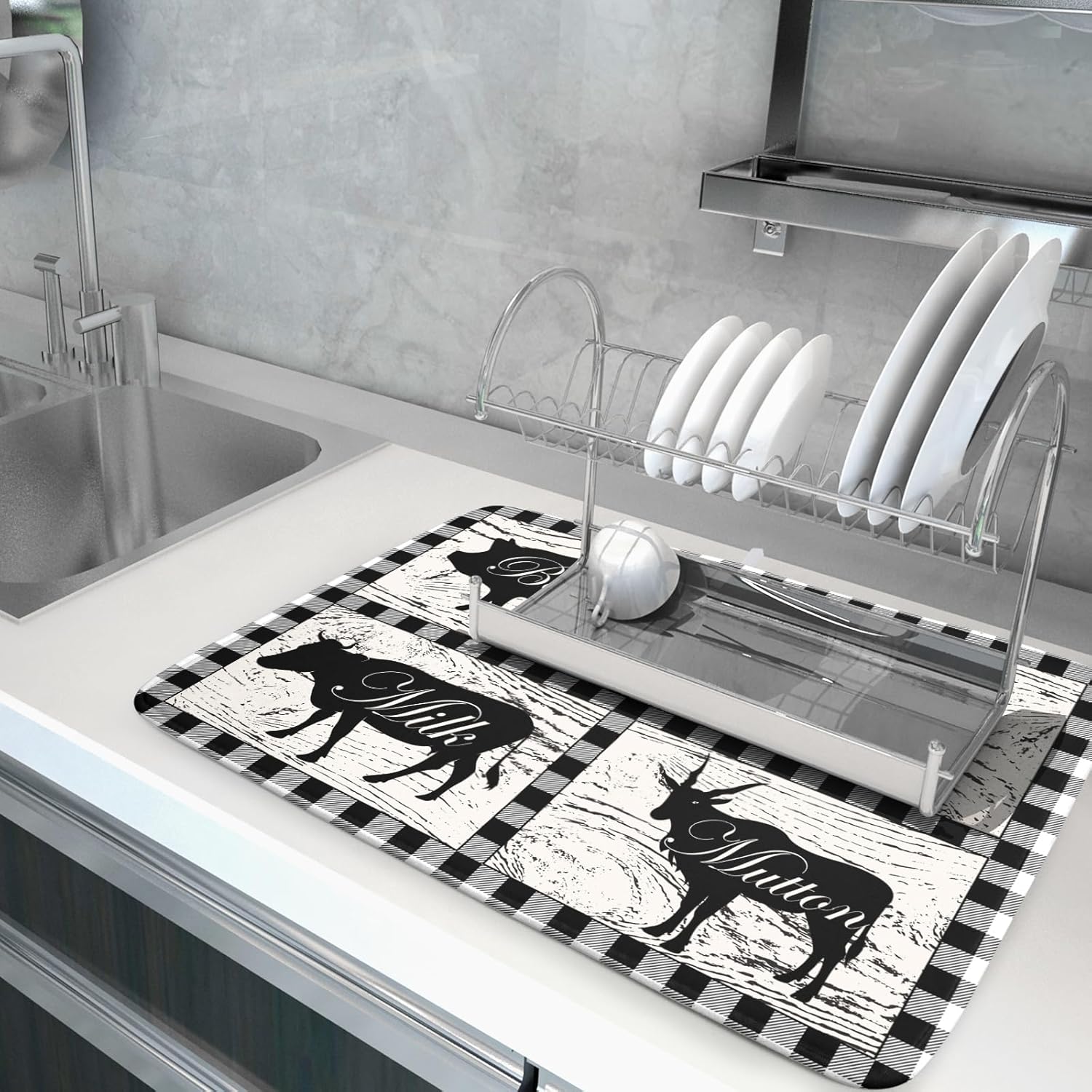 Farmhouse Animal Dish Drying Mat Buffalo Plaid Drainer Rack Mats Fast Dry Absorbent Kitchen Countertop Protector Dishes Pad 18x24 Inch