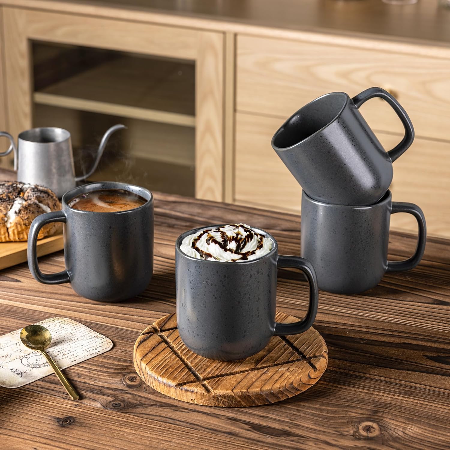 - 14OZ & VERSATILE : Perfect size for home and office daily use, even if you don't want to fill them, a normal cup of beverage is easier to handle without concern of spilling. Large capacity not only meet your coffee need, But also a great choice for tea, soup cocoa and more.