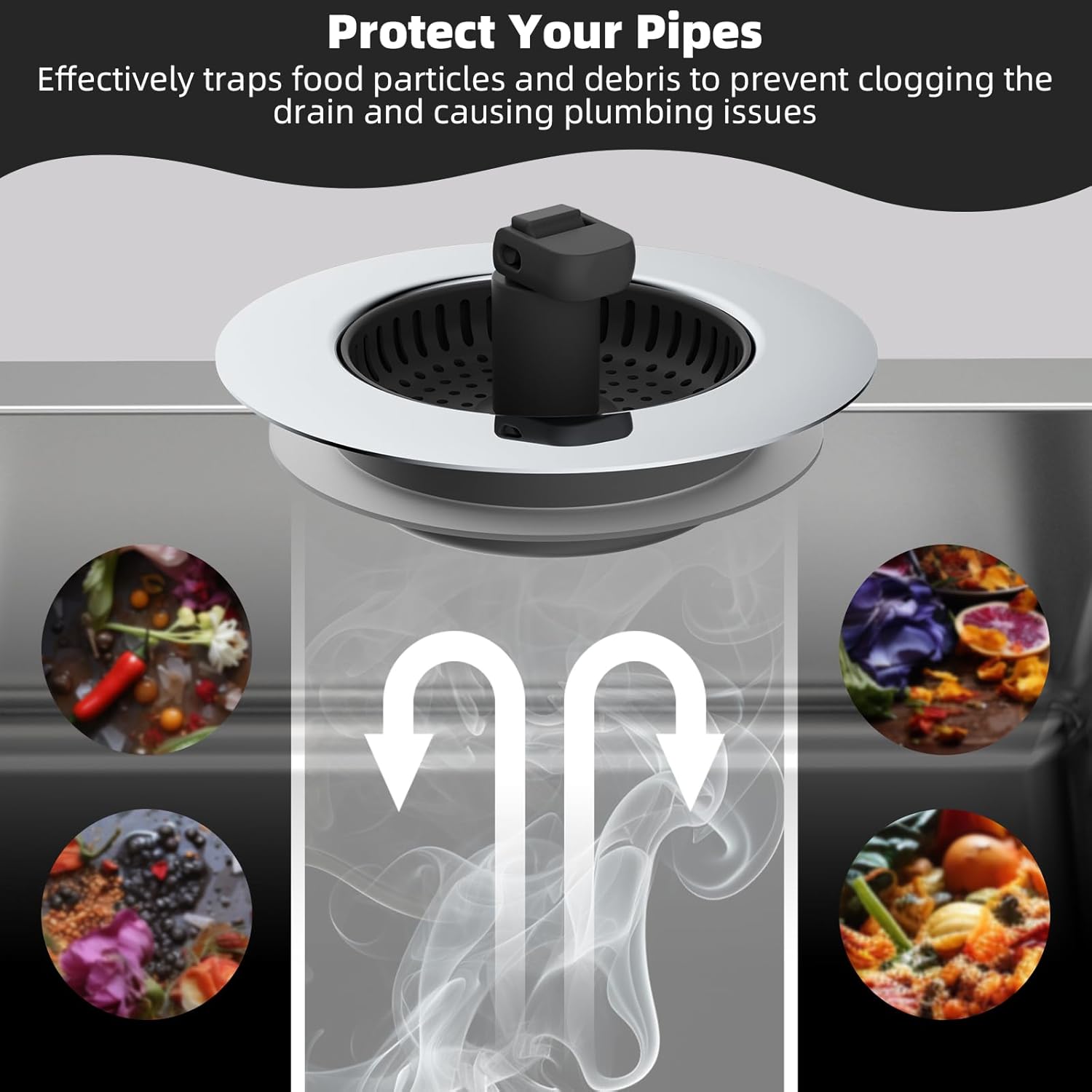 - 【Multi-functional Design】This sink strainer integrates water storage, filtering, and smell control. Equipped with multiple sealing gaskets, it ensures leak-free water storage whilst effectively blocking drain smell. It can also be utilized as a water reservoir for cleaning and soaking. The perforated basket facilitates efficient kitchen waste filtration without obstructing water flow, preventing blockages