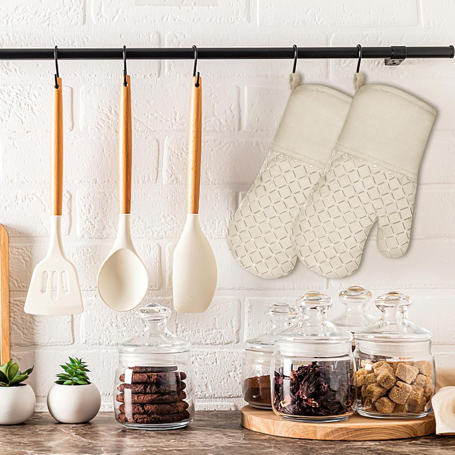 - 【Non-Slip Silicone Pattern】With the refined silicone coating, the Black Oven Mitts have a firm grip on baking trays, pots and pans, so you don't have to worry about the baking tray slipping or falling off when you take it out of the oven.The kitchen oven mitts come with rope design, so it is easy to store and hang them via the suspension rings when you are not using, save your room and make your kitchen look more cleaner