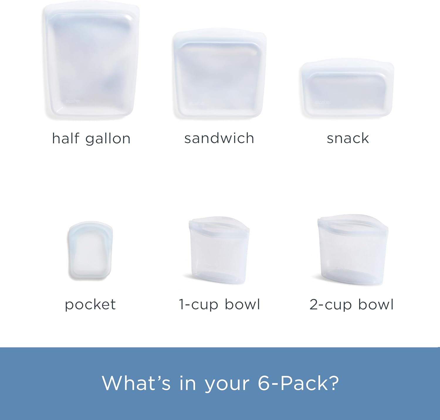 Stasher Premium Silicone Reusable Food Storage Bags, 6-Pack, Clear, Multi-Use Food Storage Bags, Lunch Bag, Travel Containers, BPA Free, Leak-free, Dishwasher-Safe, Eco-friendly