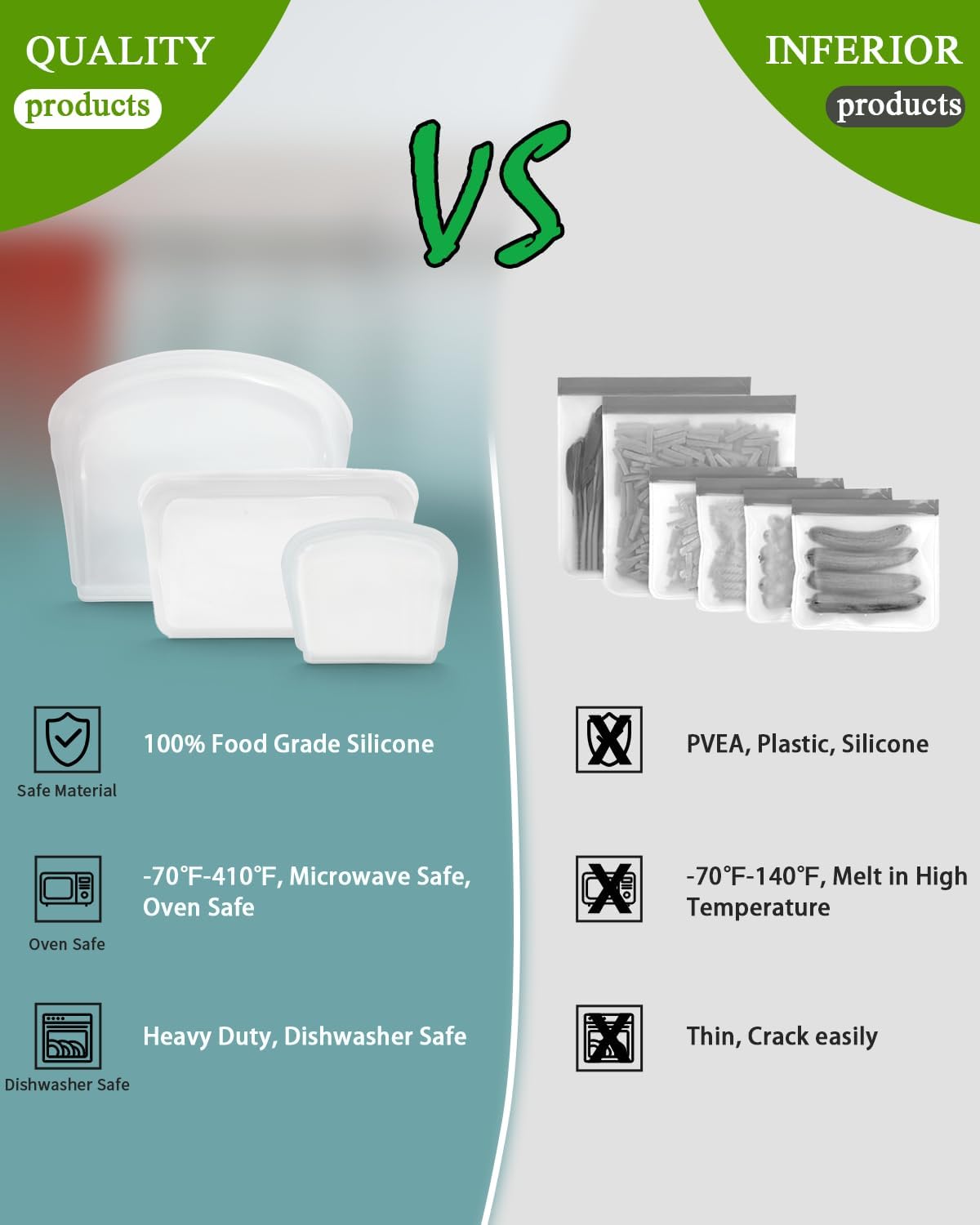 - FOOD GRADE SILICONE: Made from 100% premium food grade silicone, BPA, PVC, latex, and phthalates free. Compared with traditional plastic bags, our silicone food storage bags are environment-friendly!