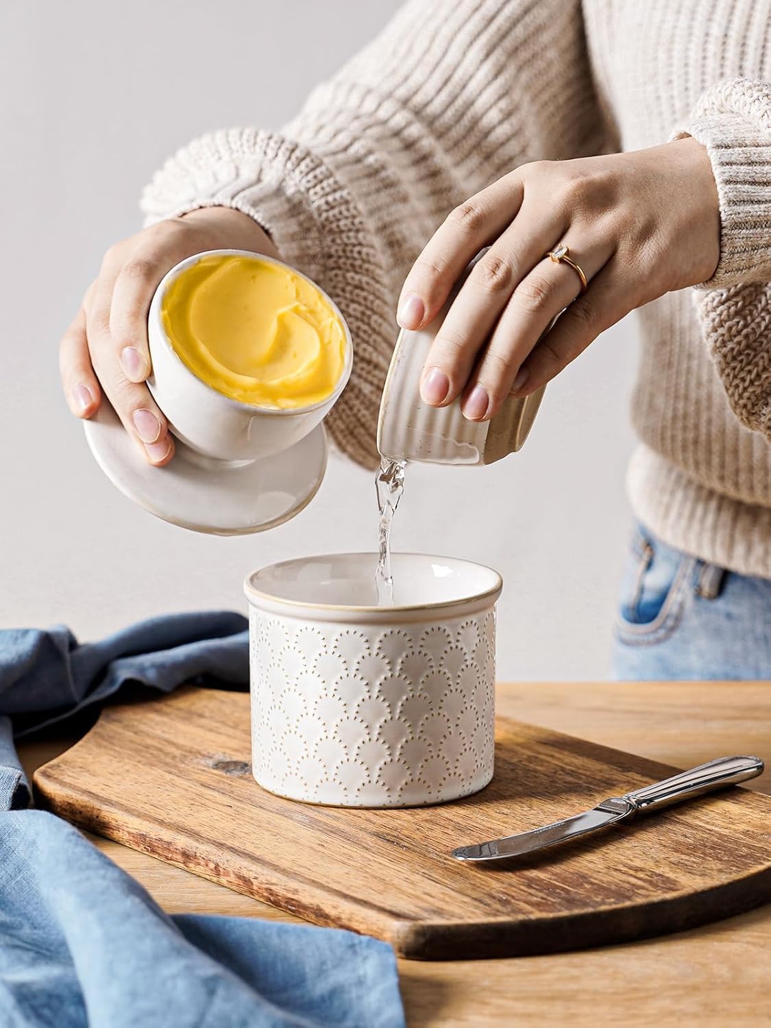 - Keep Butter Fresh And Soft: Joanna Series butter crock, limit capacity 5oz, fits one stick of butter. Press the butter in the lid to avoid air bubbles and add water up to the line on the base (use salted water for unsalted or low-salt butter). The water in the base will create an airtight seal, keep the butter fresh and spreadable! Please Note: The temperature should be below 70 degrees F for storing your butter crock