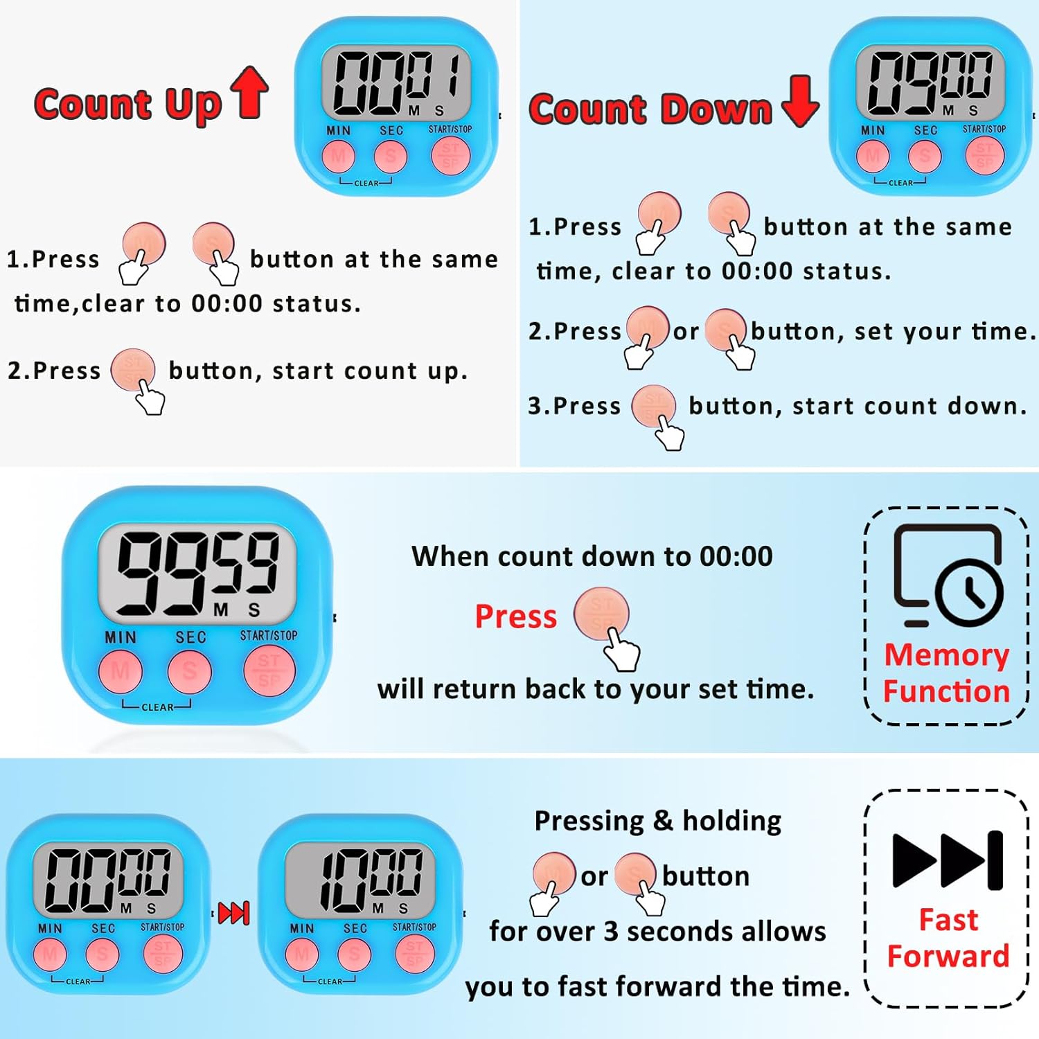 - Digital Timers: Large screen, bold digits for easy read and the buzzer is loud that you can hear clearly even in another room to remind you on time.