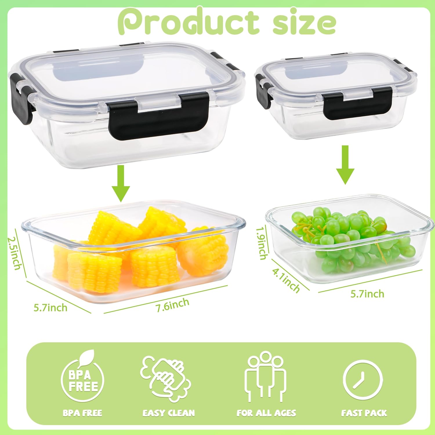 - 10 Packs Glass Food Storage Containers:With 5 packs 34oz(8”x6.5”x3”)containers and 5 packs 13oz(6”x4.5”x2.1”) containers,Great set,Two sizes, tight-fitting lids,(Note: the bottoms are glass; the lids are plastic.) use them to meal prep and keep leftovers,They are very universal from freezing to baking and the lids do not leak.