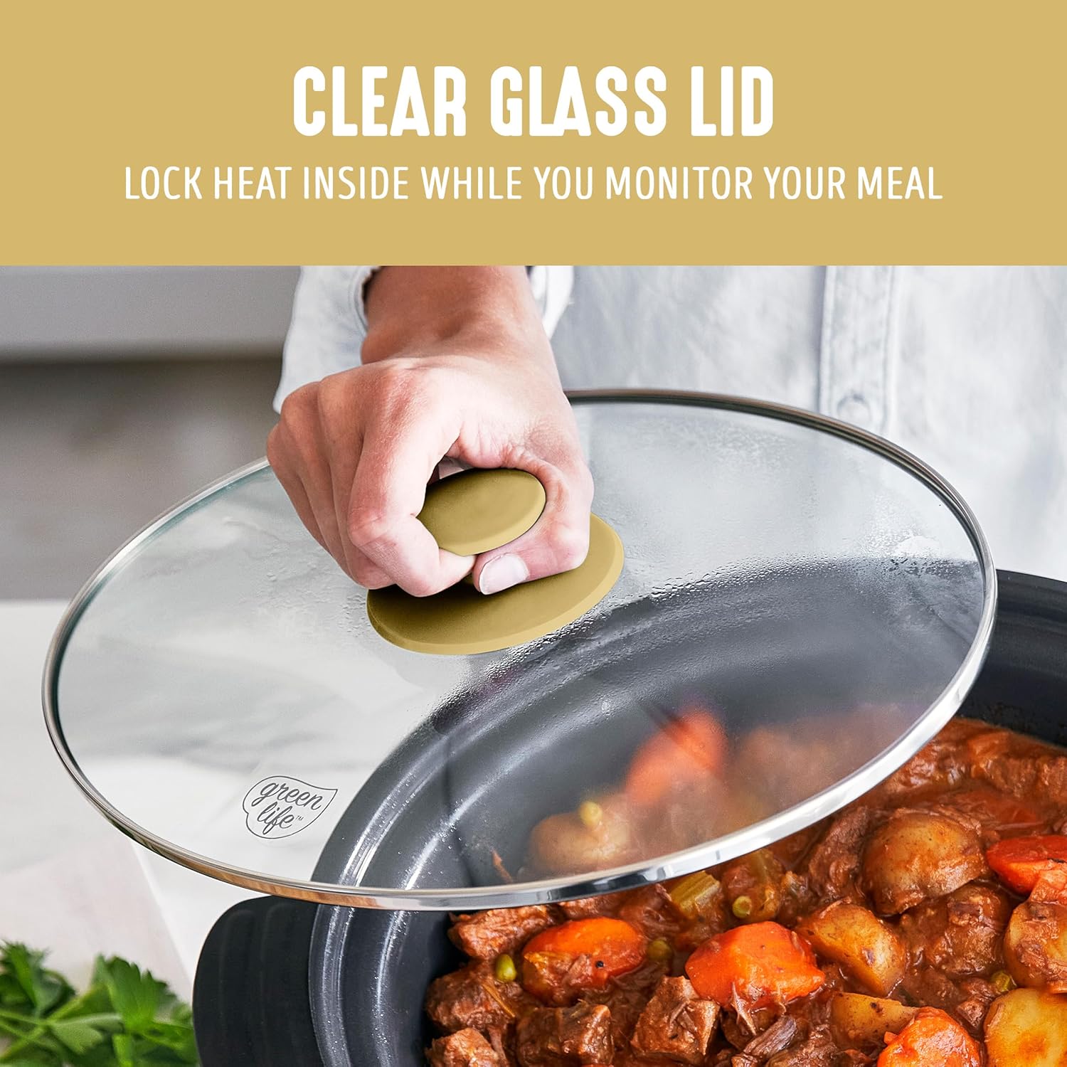 - CLEAR GLASS LID: A clear glass lid lets you keep an eye on your meal.
