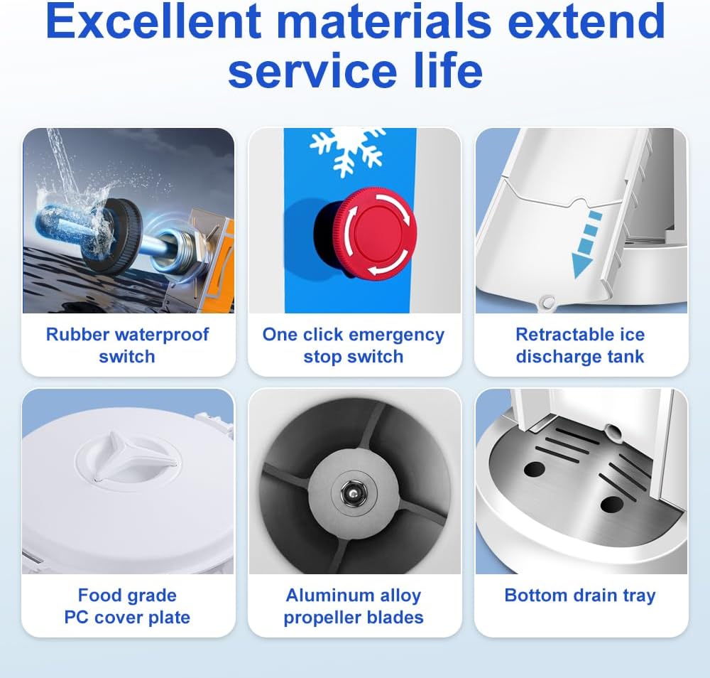 - 【Strict Quality Control】Our shaved ice machine constructed with high quality ABS material and durable aluminum rotary blades. Food grade stirring paddles are easy cleaning and protects your health. The drainage port and sanitary water tray at the bottom of the ice shaver will drain excess water and prevent water from leaking on surfaces.