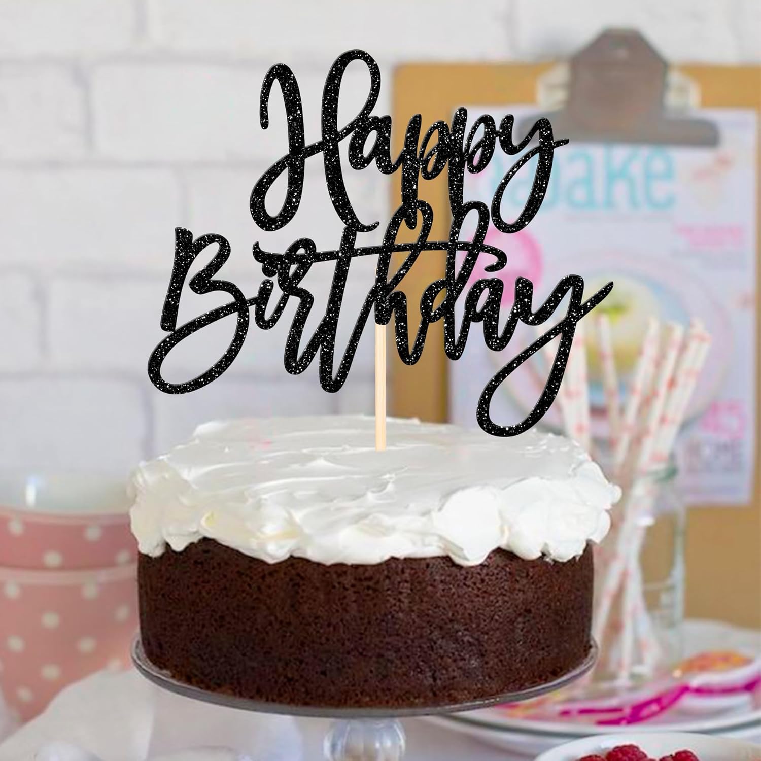 ZHUOWEISM 1 PCS Happy Birthday Cake Topper Glitter Happy Birthday Cake Pick for Celebrating Happy Birthday Anniversary Theme Party Cake Decorations Supplies Black