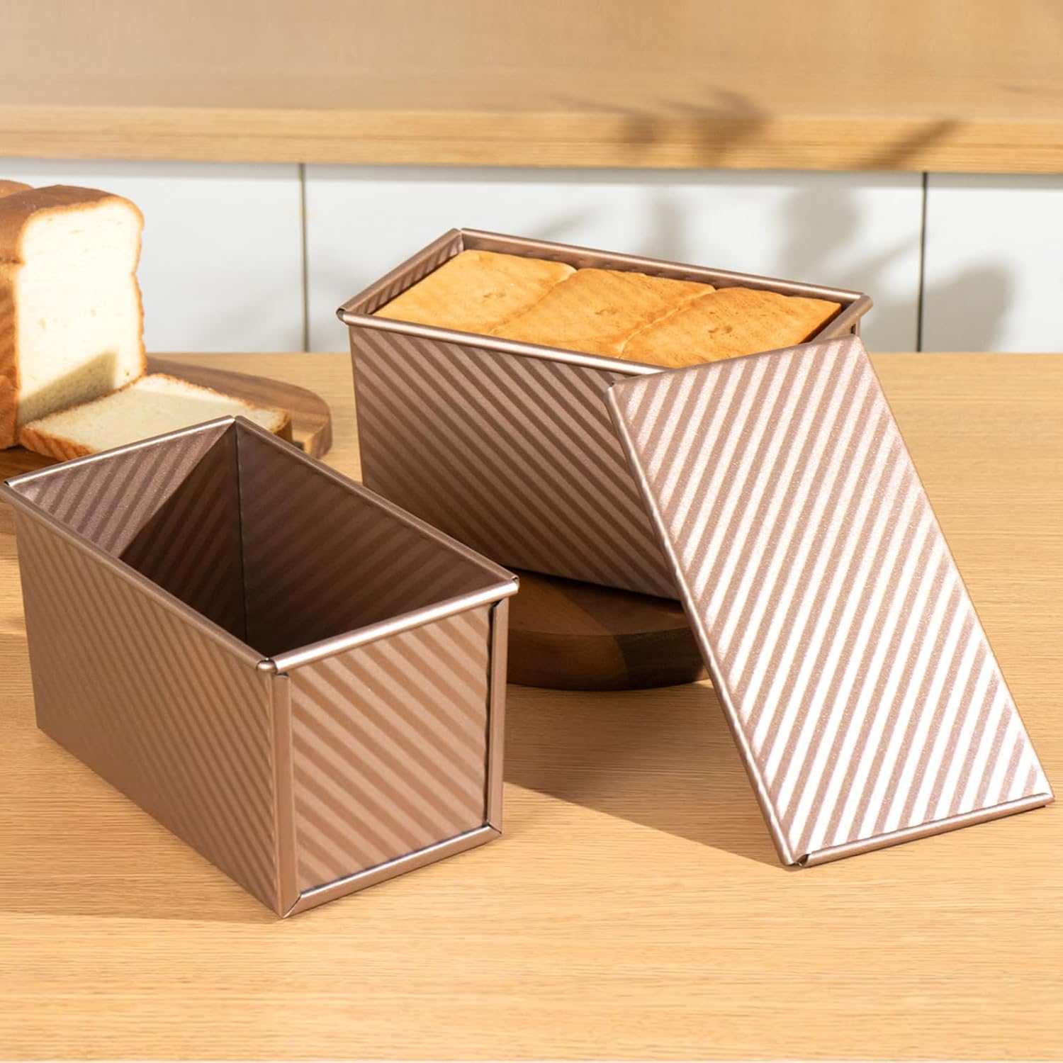 2 Pack Pullman Loaf Pan with Lid, 1 lb/0.5 lb Dough Capacity, Carbon Steel Corrugated, Non-Stick Sandwich Bread Loaf Pan with Lid
