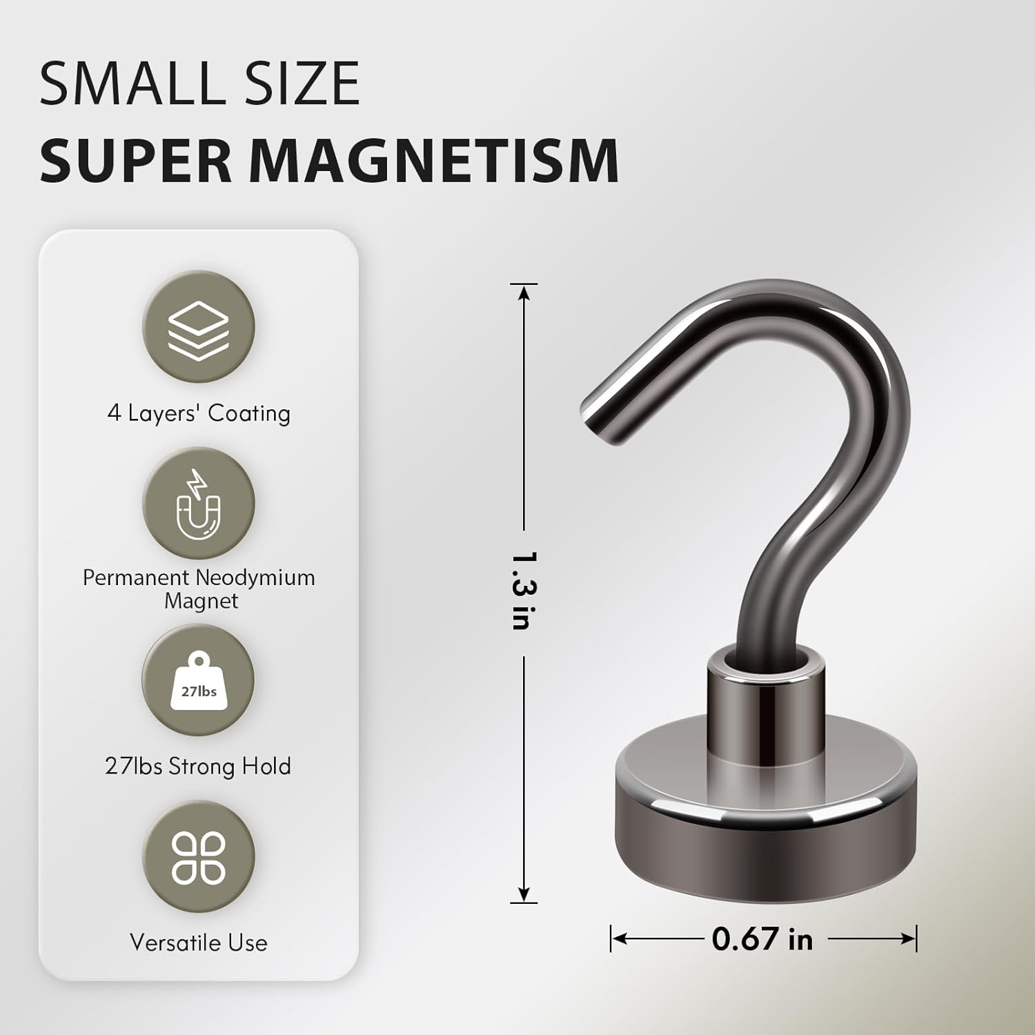 - ✔ HIGH-LEVEL PLATING- We offer 4 layers of coating on the magnet hook metal base, metal hook, and magnet. It provides this magnetic hanger with a shiny, rust-free, and mirror-like finish. Coated magnetic hook particularly exhibits an excellent anti-corrosive properties and scratch resistance. Maintenance-free, no rust!