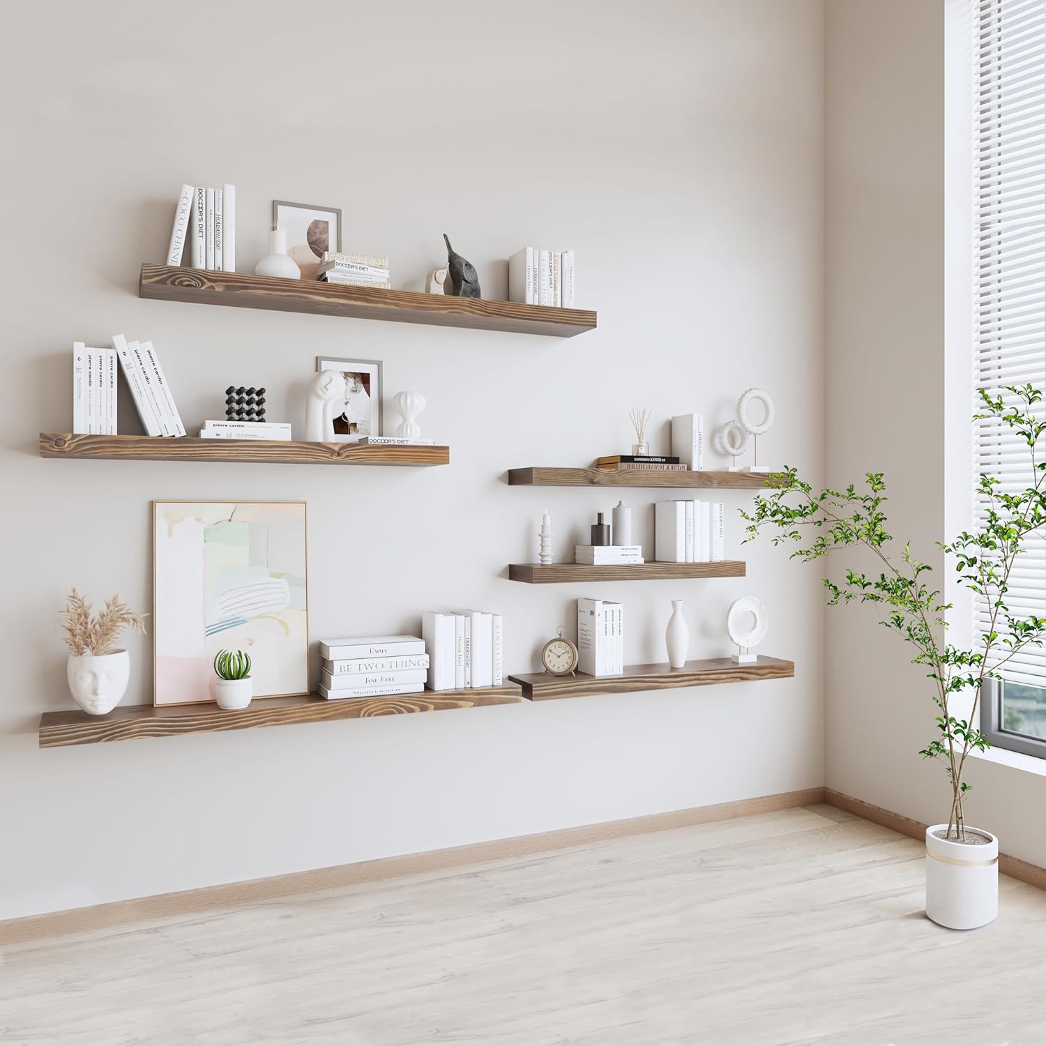 - Solid Wood Floating Shelves: The 60 inch wood Floating Shelf is made from 100% solid pine, selected for its beautiful wood grain texture and knotted into points, with a sanded, hand-stained finish that gives the space a rustic, natural, warm feel. Note: All steps are done by hand and each ledge is slightly different, but equally stunning!