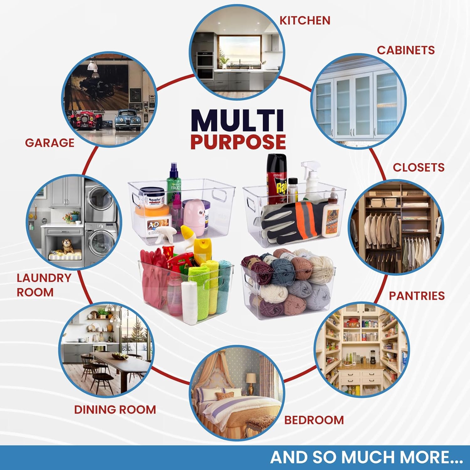 - YOU WON'T FIND A MORE VERSATILE SET OF BINS: You can use these large clear plastic storage containers with lids for organizing any space in and around your home – the kitchen, cabinets, refrigerator, closets, pantries, bedroom, dining room, laundry room, nursery, garage, kids toy room, under sink organizers and more.