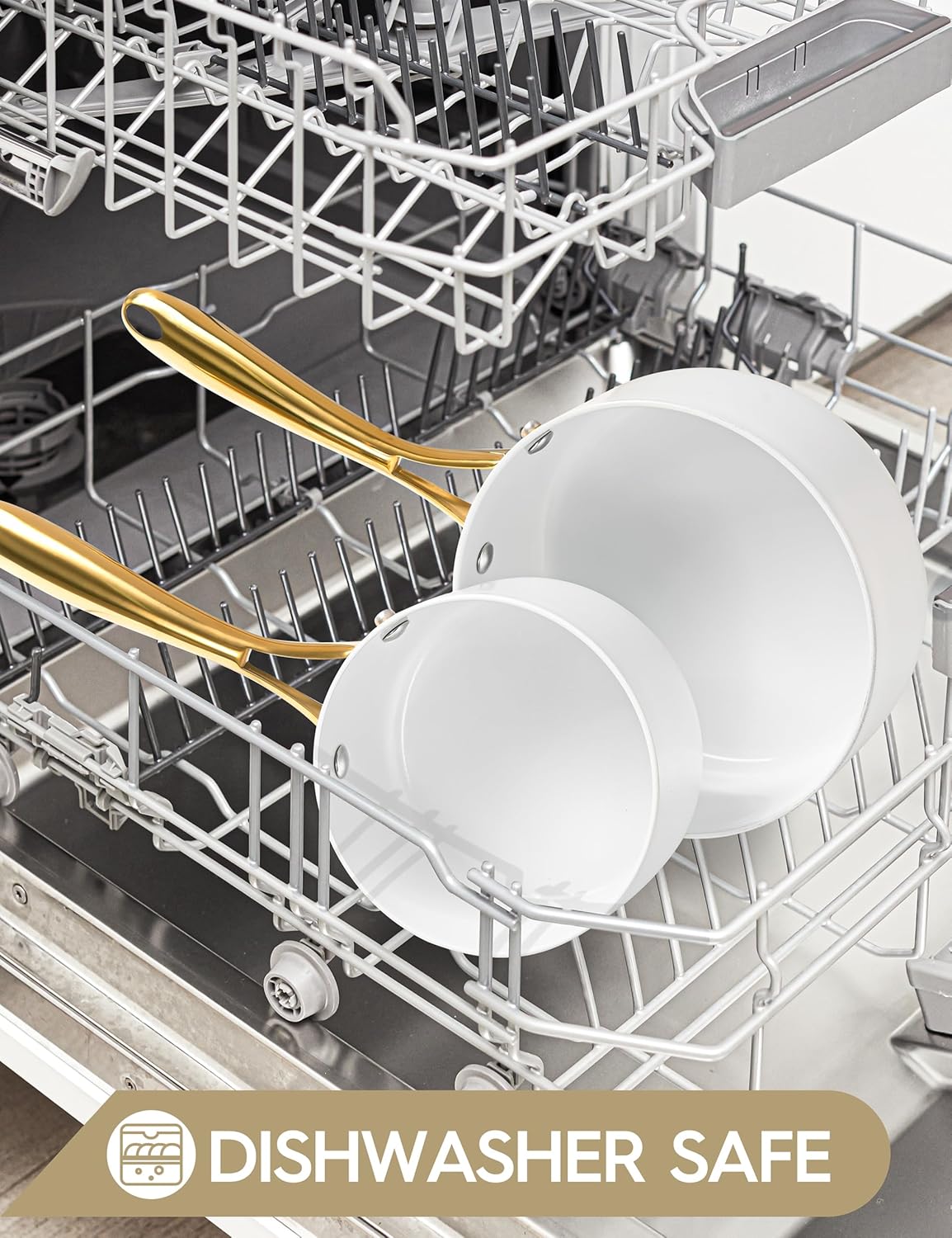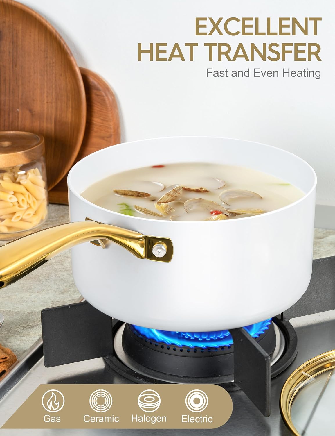 - Stunning Kitchen Artwork – Bring a touch of elegance to your kitchen with this sleek ceramic saucepan set, complete with beautiful gold stainless steel handles.