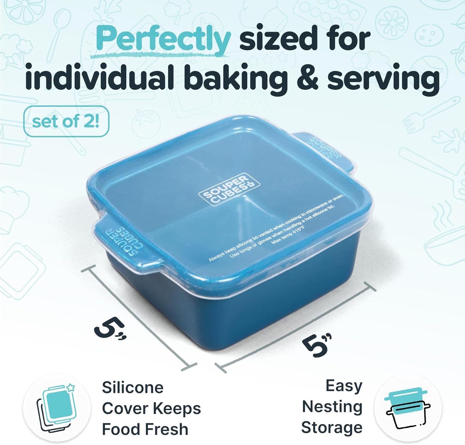 Souper Cubes Stoneware - 5" x 5" Baking Dishes for Oven with Silicone Covers, Premium Mini Ceramic Baking Dishes, Perfect for Reheating Individual Portions in Oven or Microwave, Set of 2 - Blueberry