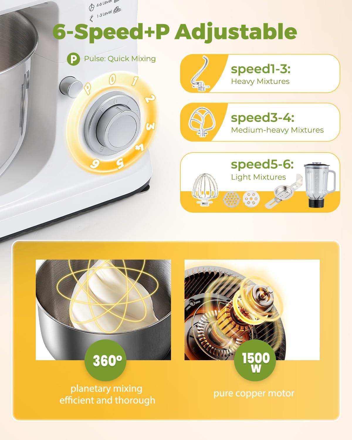 - Powerful 1500W Pure Copper Motor & Planetary Mixing: Delivers high-torque performance with 6 precise speeds for everything from slow stirring to fast mixing. The planetary action ensures thorough, uniform blending for perfect texture and taste