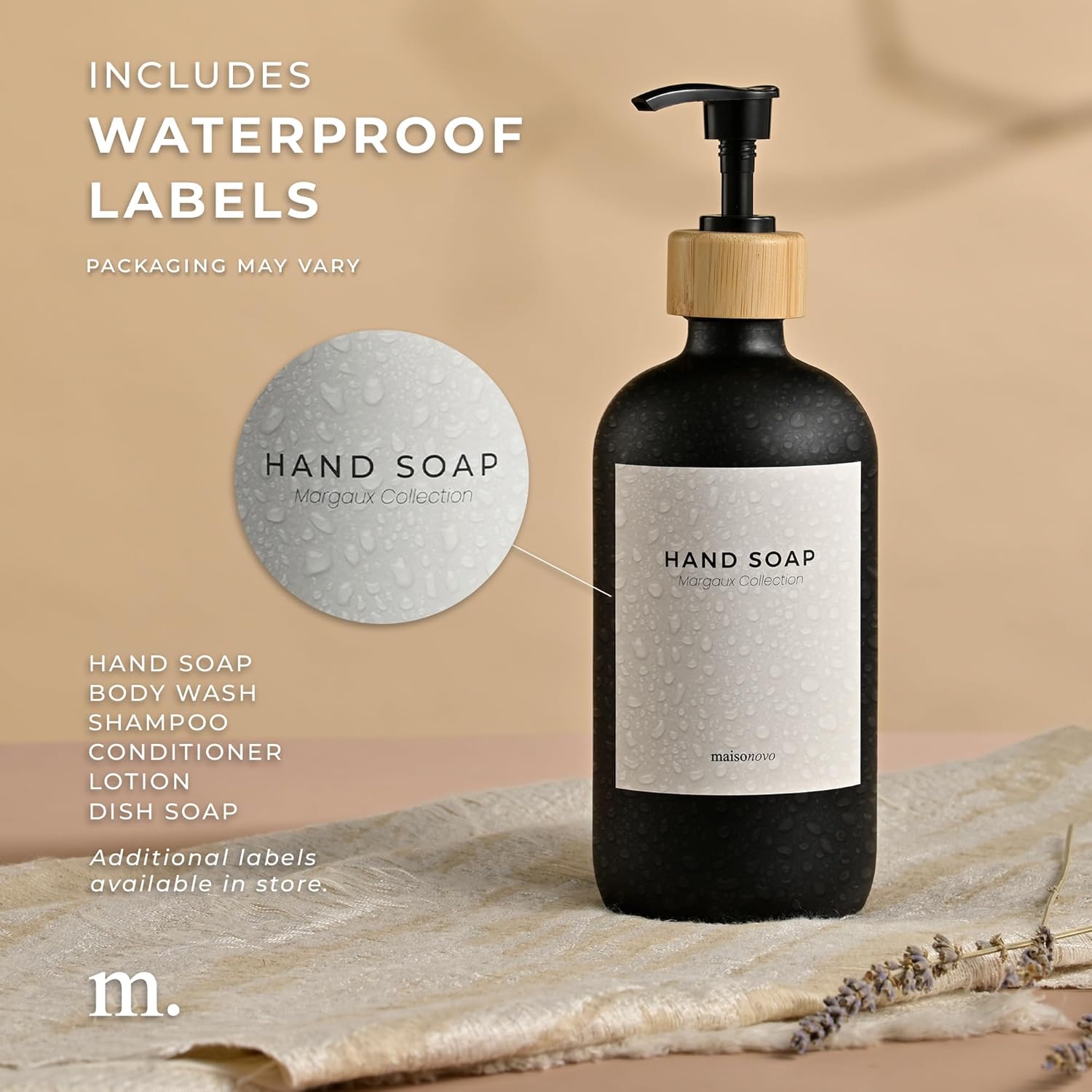 - This Pack Includes: A complete kitchen soap dispenser featuring a 16.9oz glass soap dispenser with pump bottles. Their elegant design is perfect for use as a hand soap dispenser for bathroom or kitchen, and comes with six durable, waterproof labels for organization: Hand Soap, Dish Soap, Body Wash, Lotion, Shampoo, and Conditioner.