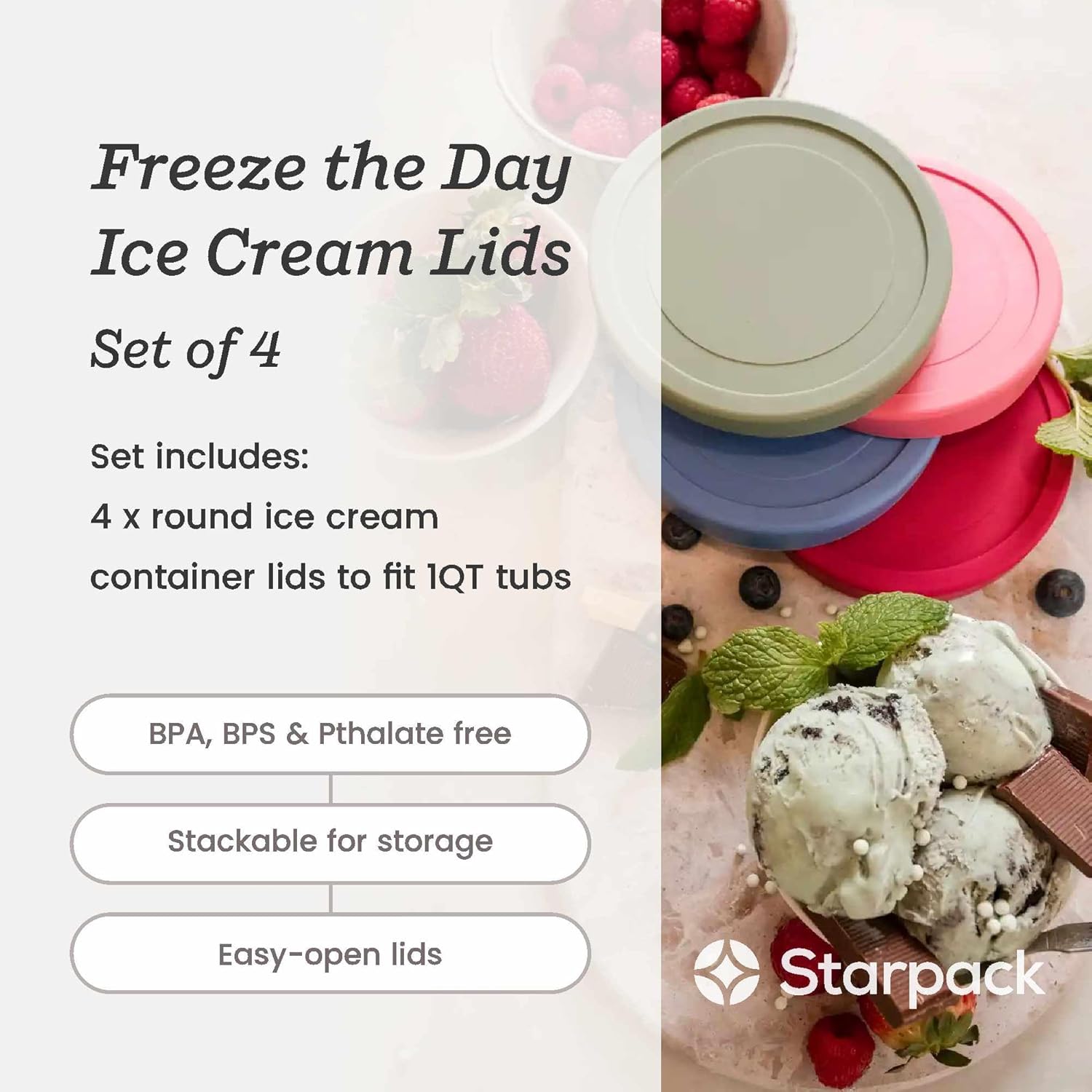 Starpack 'Freeze the Day' Leak-Free Lids for Ice Cream Storage Containers for Freezer (4 Pcs) - 1 Quart Ice Cream Containers for Homemade Ice Cream - Reusable Ice Cream Containers with Lids (Silicone)