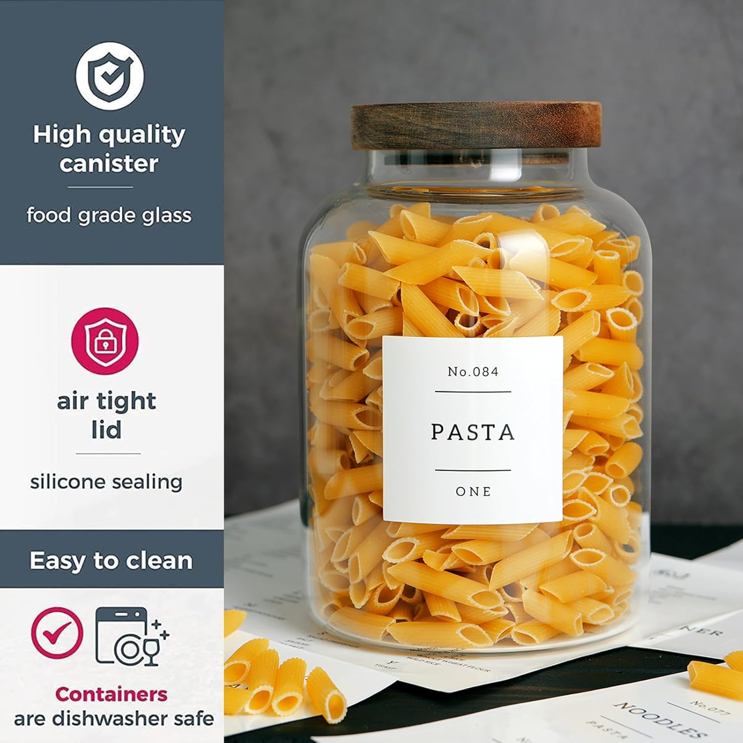 Set Of 2 Large Glass Jar with Wooden Lid with 132 Labels, Glass Storage Jars for Flour Pasta Candy Coffee Cookie and More(70 FL OZ/2000 ml)