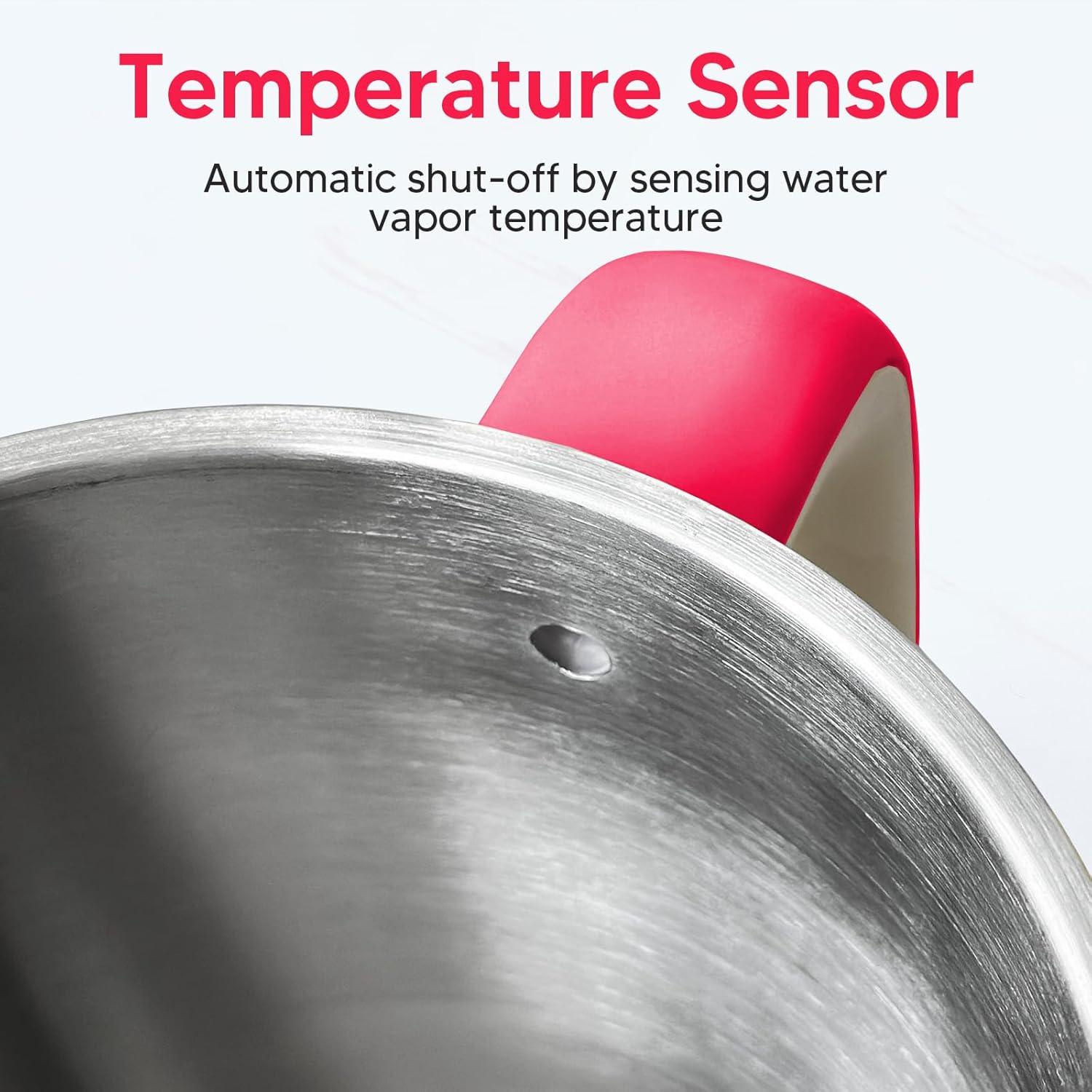 - 【Auto Shut Off with Boil-Dry Protection】~ Experience peace of mind with the electric kettle's auto shut off feature and boil-dry protection. Simply ensure the lid is covered before boiling. This tea kettle automatically turns off when water reaches boiling point or when no water is detected, preventing overheating and boiling dry. After shutdown, it enters standby mode, ready for your next boil.