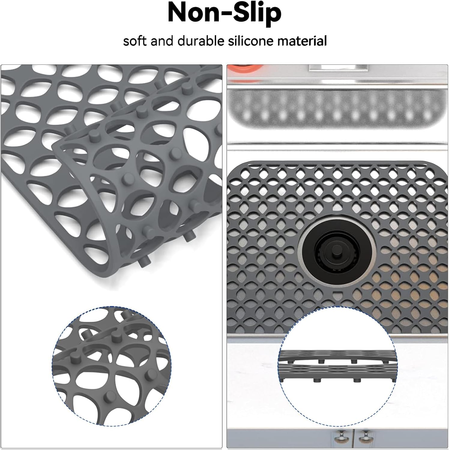 - Raised Sturdy Bottom Feet Design: Non-slip and raised feet elevate the kitchen sink mats with drain hole to allow little food particles and water run through it. Also work as a dish drying mat under the sink.