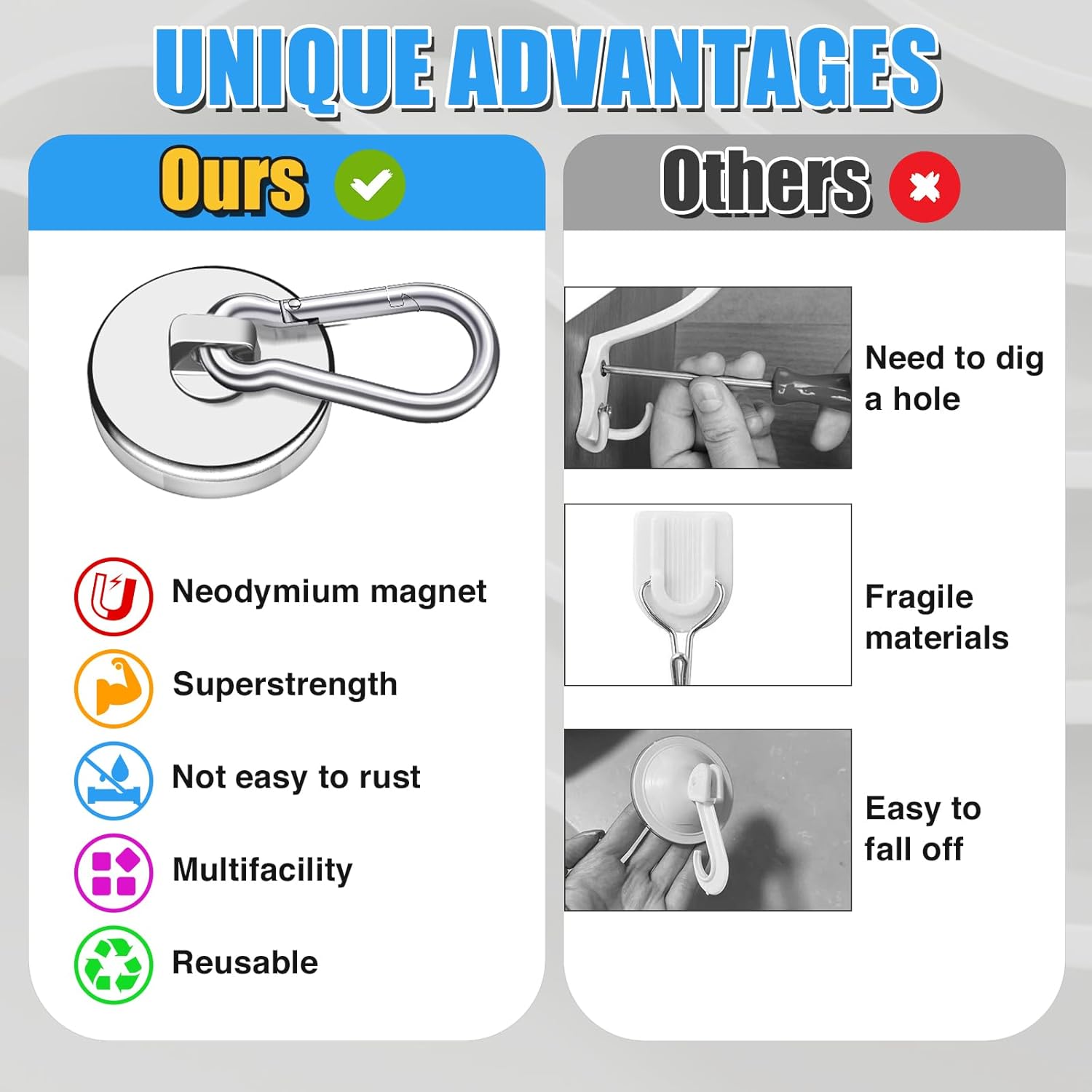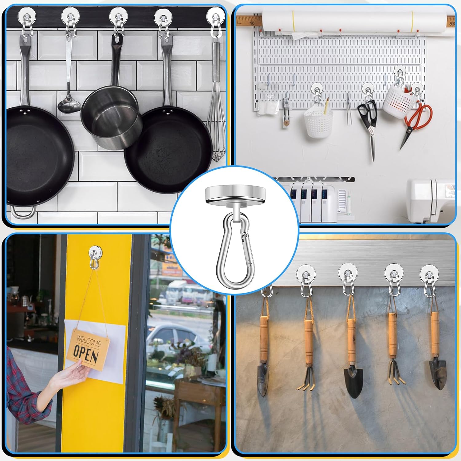 - 【Easy Installation】- Our heavy duty magnetic hangers do not require tools and can be easily installed by attaching them to metal surfaces without the need for drilling holes, and our magnetic swivel hooks will not leave scratches or residual stains on the surface of objects, unlike adhesive hooks. The spring-loaded hooks are perfect for quick closure.