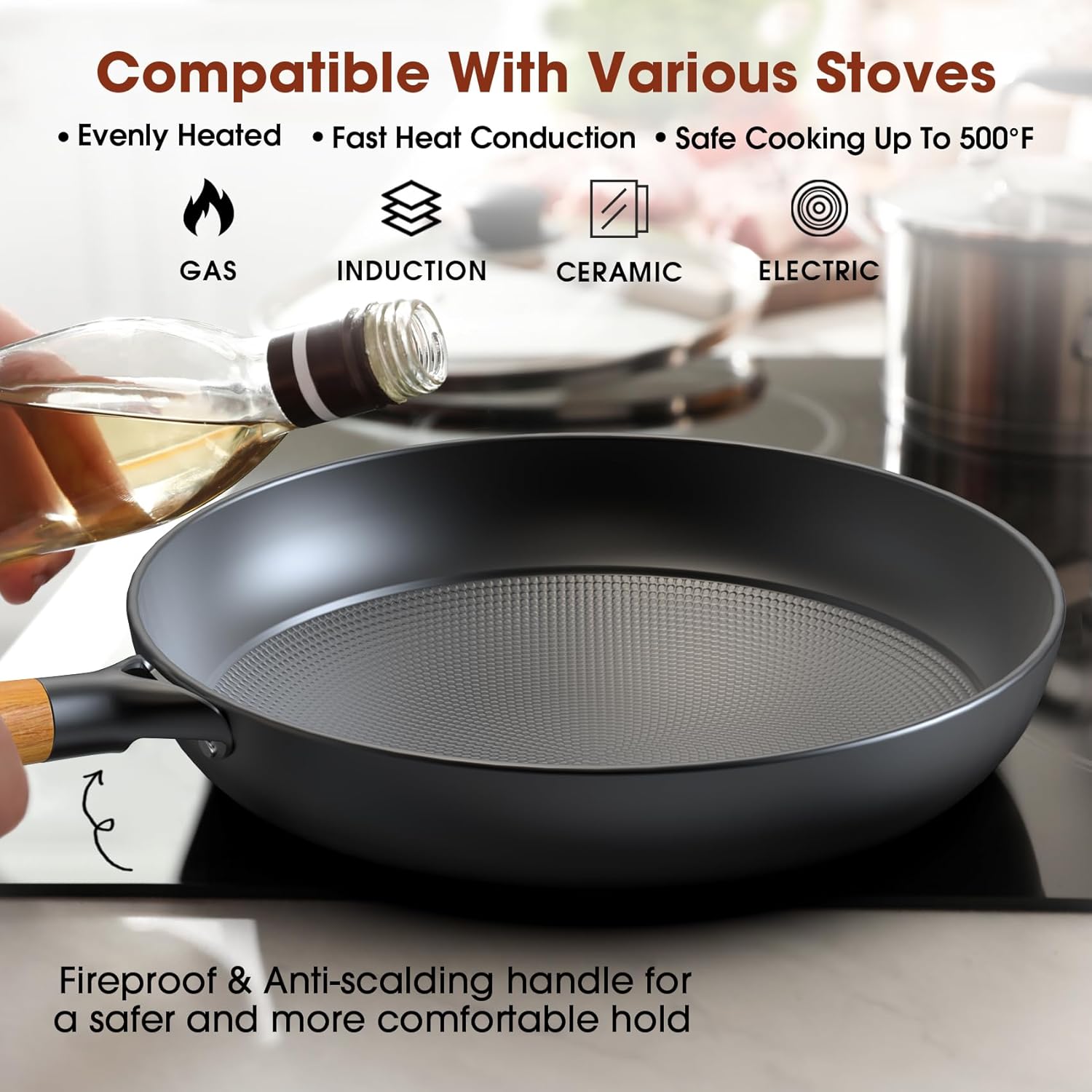 - Efficient & Even Heat Distribution - Experience the superior fast and even heat conduction frying pan. With exceptional heat retention, your food will stay warm for longer periods. The honeycomb texture on the non-stick frying pan ensures that oil is distributed evenly, allowing for cooking with less oil and reducing fat intake. Which maximizes the unique flavors and characteristics of your ingredients. Unlocking the secret to perfectly cooked meals, Bringing you a healthy lifestyle