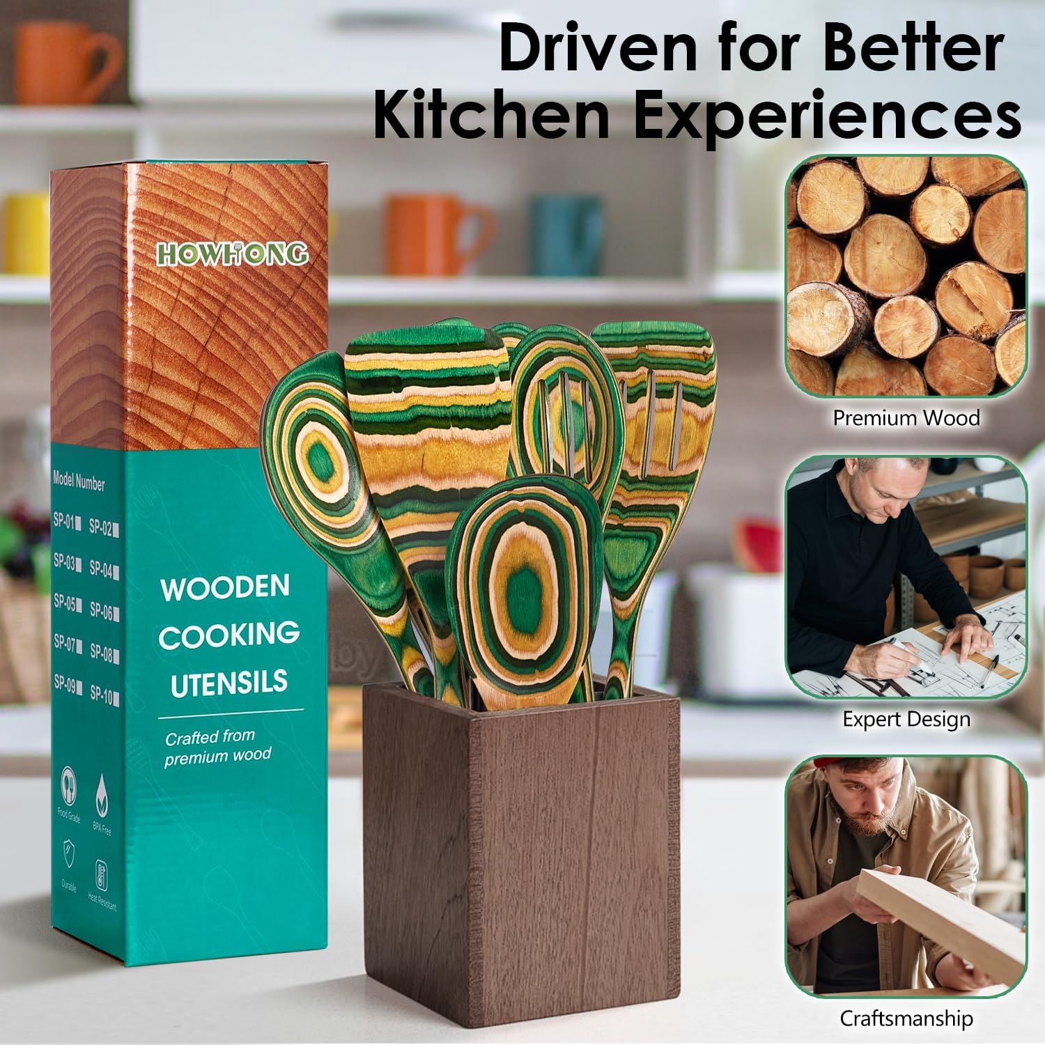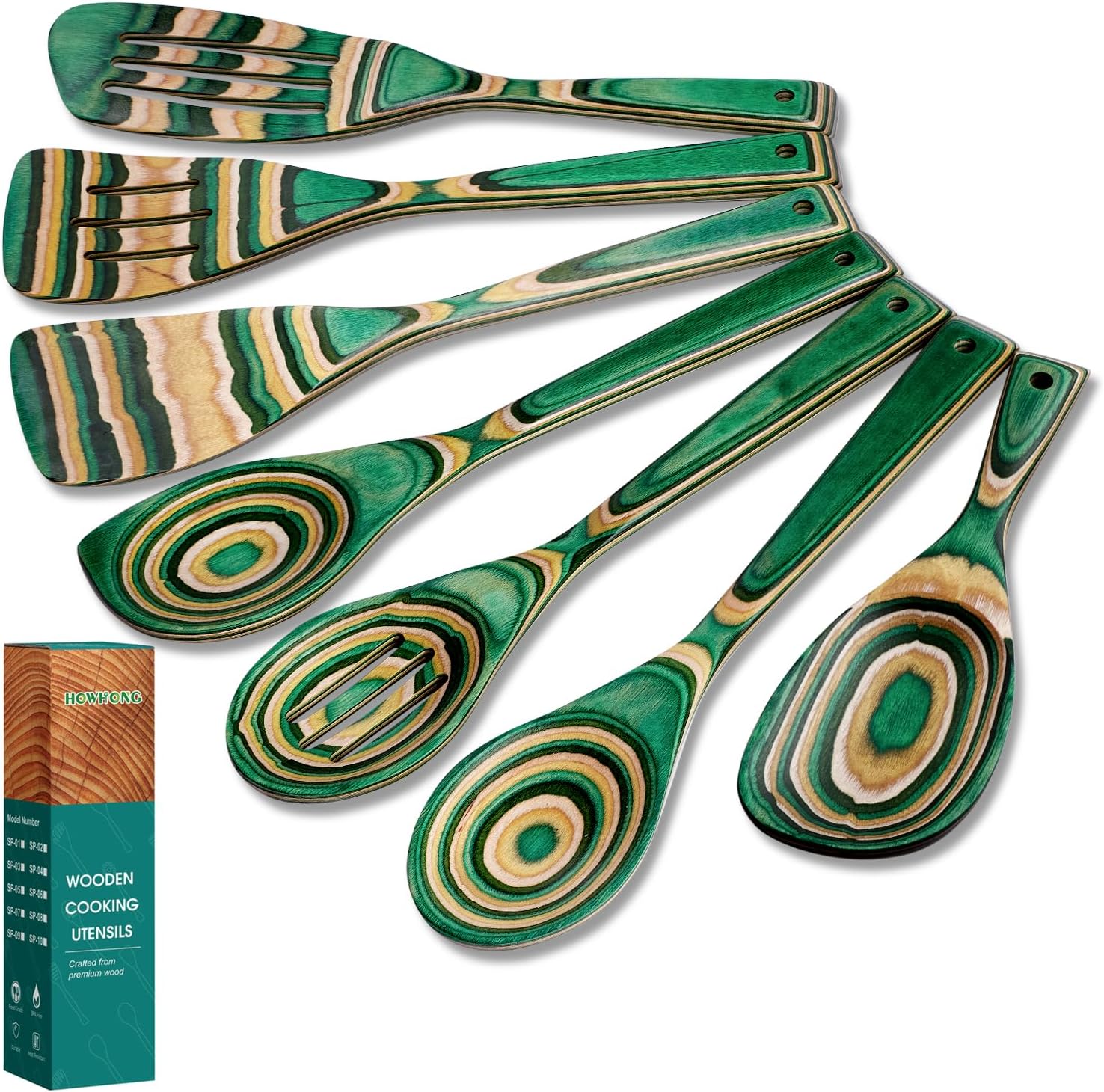 Kitchen Pakkawood Wooden Spoons for Cooking – 7-Piece Kitchen Utensil Set with Spatula, Corner Spoon, Rice Paddle – Nonstick Safe Durable Wooden Cooking Tools for Home Kitchen by Howhong (Oasis)
