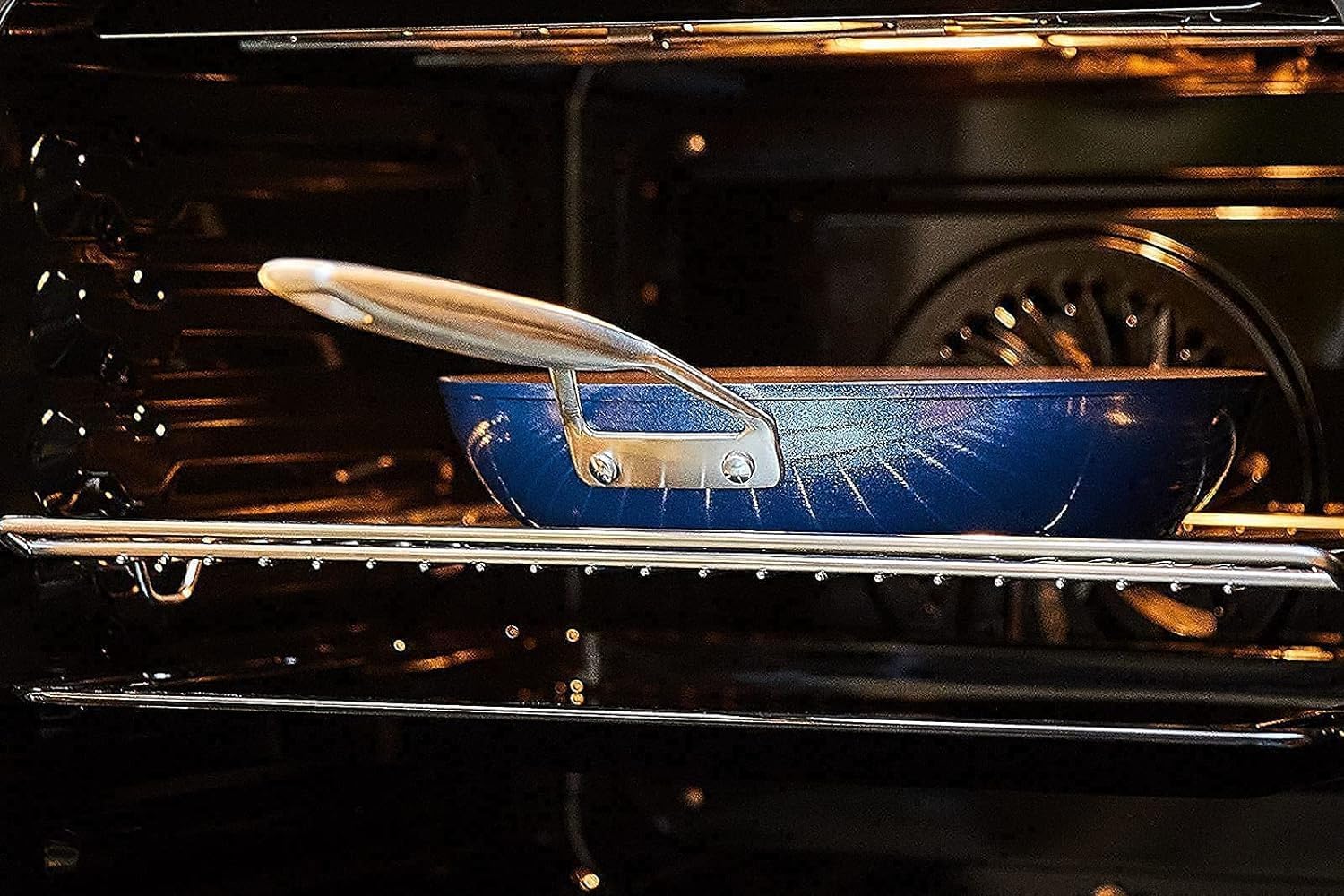 - The blue nonstick 12 inch frying pan has a vibrant, glossy finish that looks beautiful and inviting. The color is a deep, rich blue that stands out in the kitchen and adds a touch of sophistication