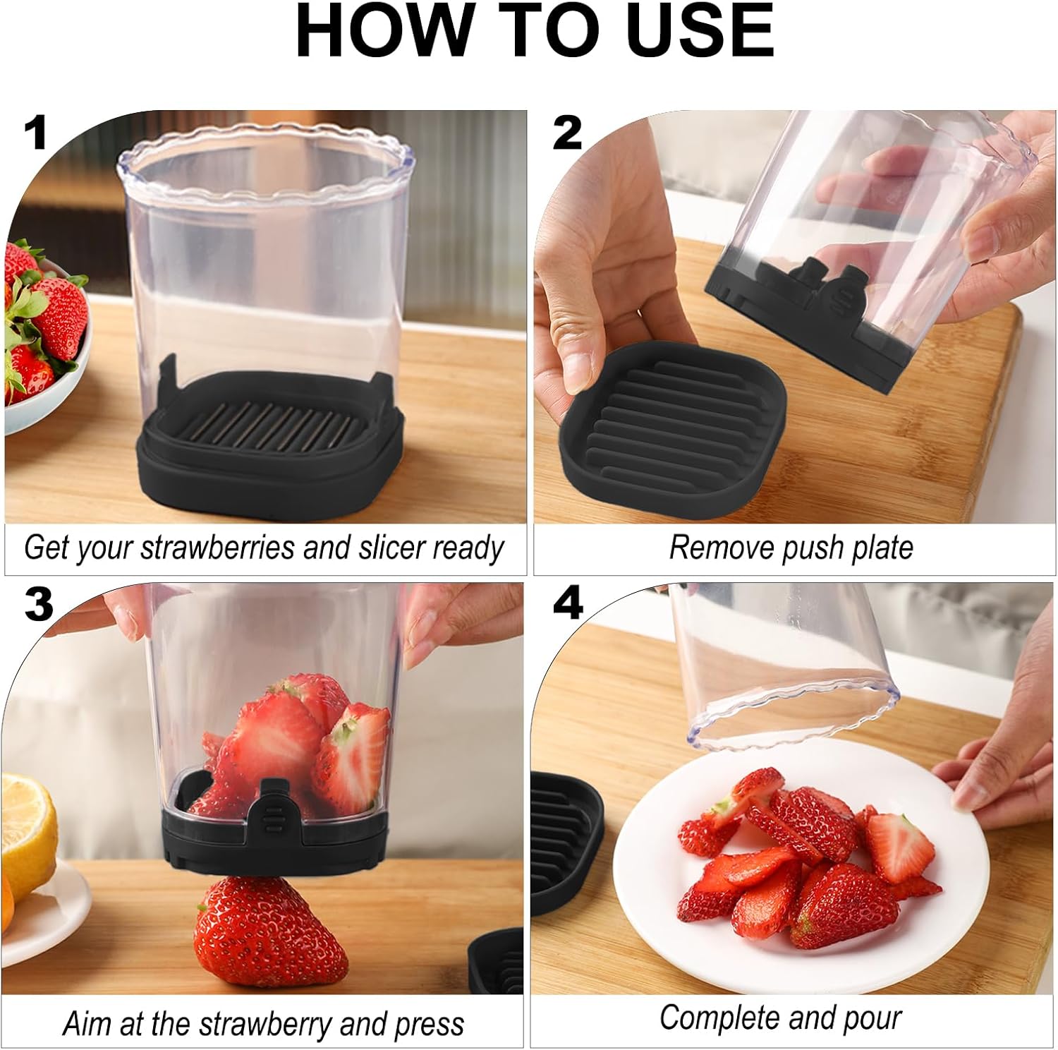 - Strawberry Slicer: The fruit slicer cup comes with a bottom base after cutting, place it on the base to push out any excess stuck food. larger-capacity fruit cutter slicer can slice multiple strawberries at one time. Strawberry slicer kitchen gadget can be in direct contact with food