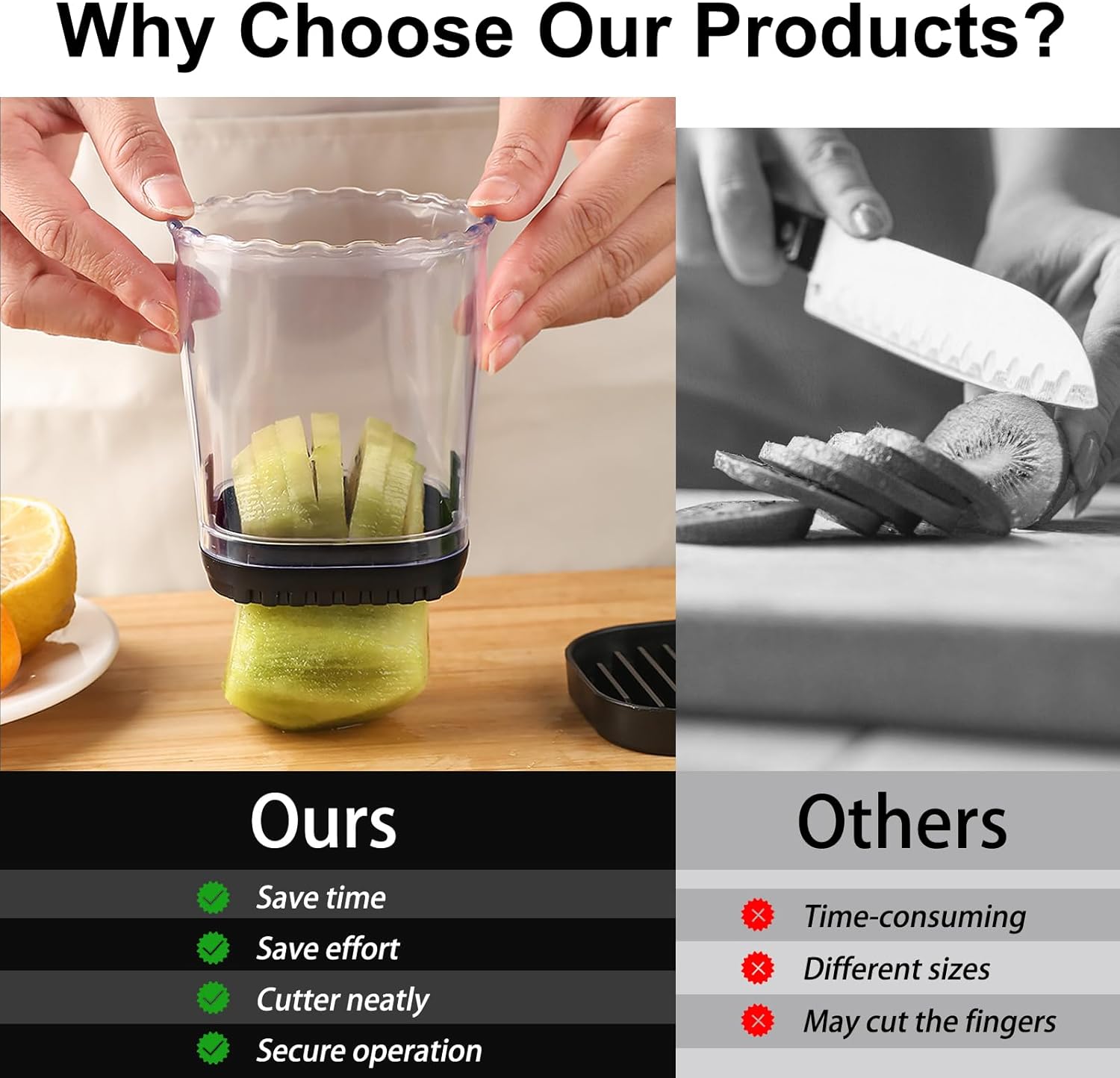 - Fruits Slicer: Fruit Slicers 8 times faster than a knife! Our fruit cutter makes prep a breeze. Easily cut 18 strawberries in 9 seconds, saving you time and energy. With this fruit chopper you can easily slice fruits and vegetables into more uniform shapes, save your time and make slicing fruits a breeze