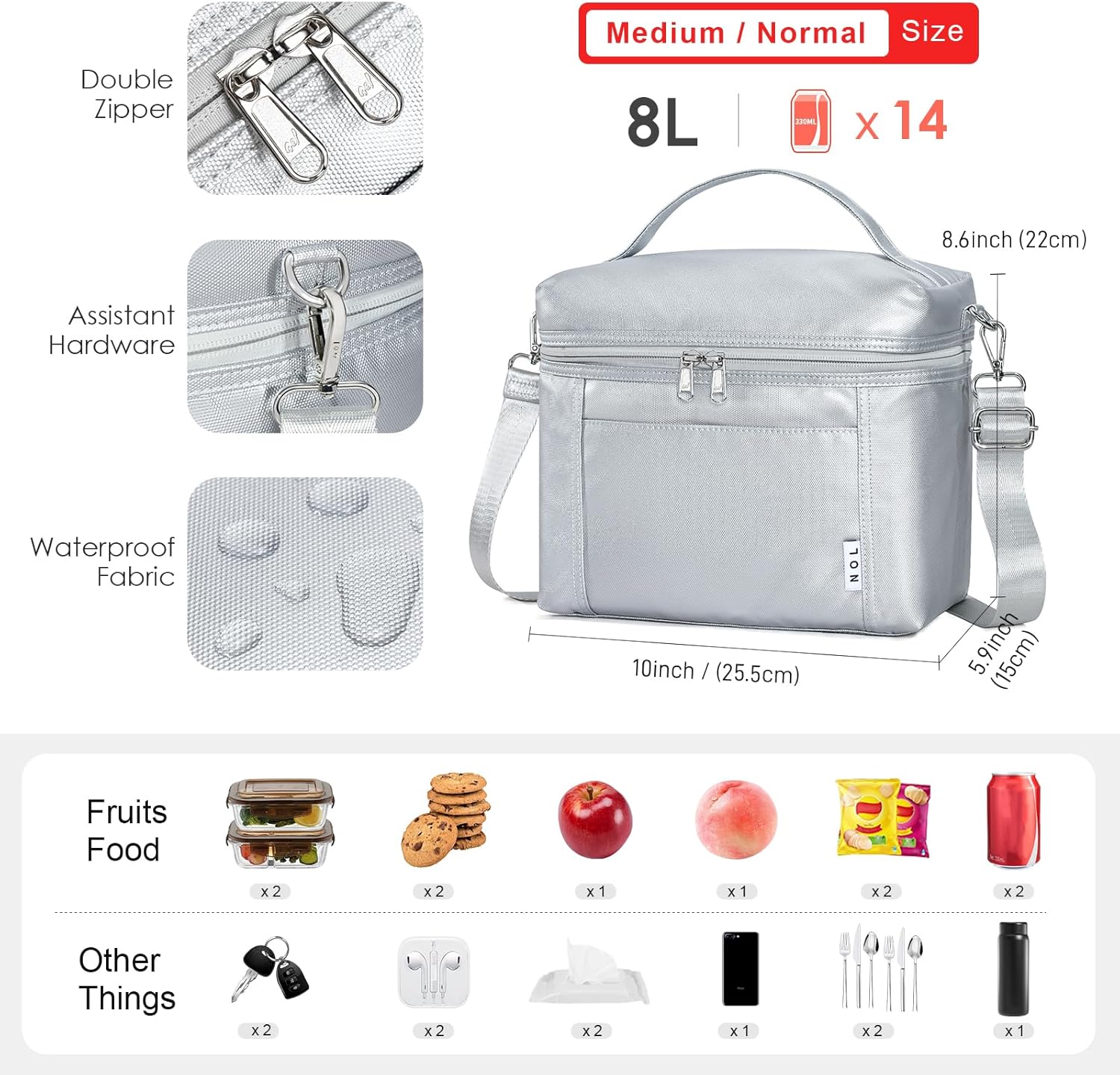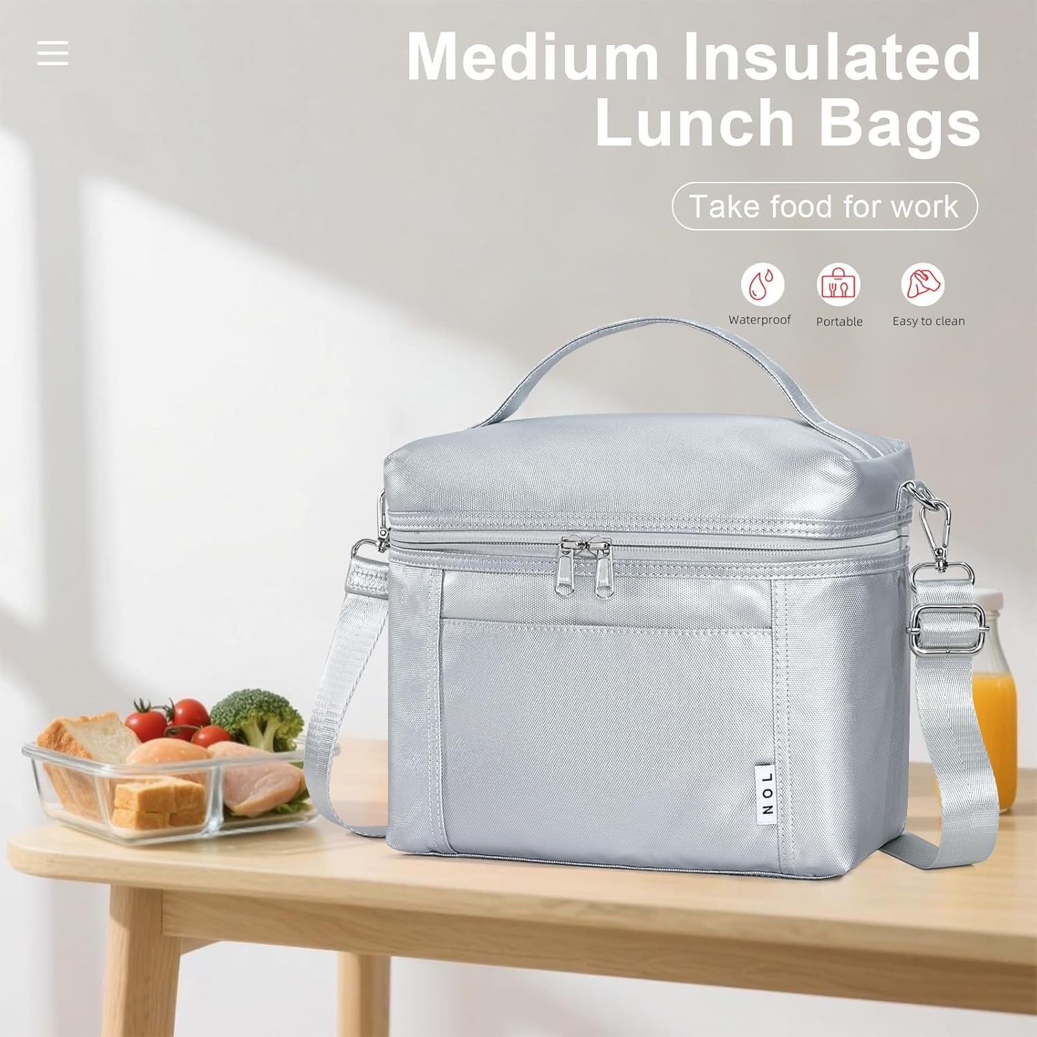 NOL Natural Organic Lifestyle Insulated Lunch Bags for Women Cooler Bag Lightweight Nylon Waterproof Lunch Box For Work (Silver, Medium(normal))