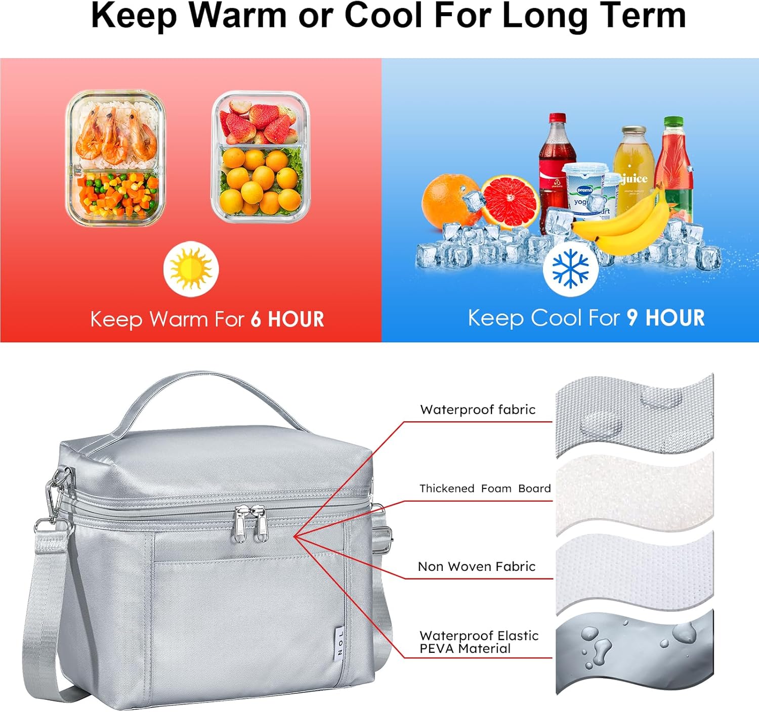- Insulation & Freezing: NOL lunch bag adopts three-layer heat insulation design: the outer layer is resistant 900D Oxford cloth and polyester fiber, the inner layer is Eco-friendly PEVA material and the middle layer is specially filled with 4mm thick insulating lining, which provide great insulation to keep the food warm or fresh up to 5 hours. Our reusable lunch box is very convenient to take food for work, office, picnic, camping and other activities.