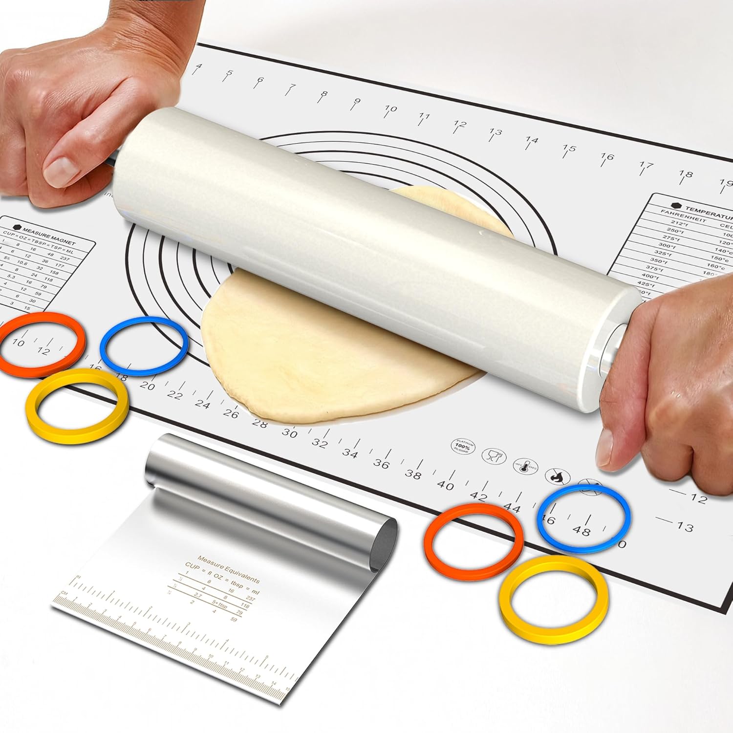 - đă3 THICKNESS RINGS AND PASTRY MAT WITH CUTTERă1/16â (2mm), 1/6â (4mm) and 1/4â (6mm) thickness rings of different diameters allow the rolling pin to roll out dough of different thicknesses. Pastry mat fits neatly on the table for easy storage. Stainless steel cutter efficiently distributes the size of dough for different needs. Wooden stand is suitable for marble rolling pins and holds it in place to prevent the rolling pin from breaking from unintentional rolling. Overall dimensions - 18.5 in. x 2.5 in. x 2.5 in.
