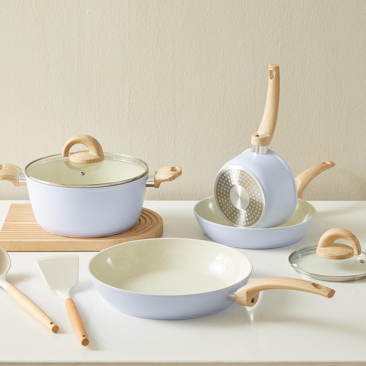- Healthier & Safe Cooking: The set features a ceramic nonstick coating made without PFAS, PFOA, PFOS & PTFE that allows for effortless food release and an even easier clean up. High magnetic conductive stainless steel base allows our non stick kitchen cookware to work on all cooktops, like Electric, Halogen, Ceramic, Gas, Induction, Glass and Oven. The Extended and Thicken Bottom Design also makes the cookware durable and heats up quickly and evenly;