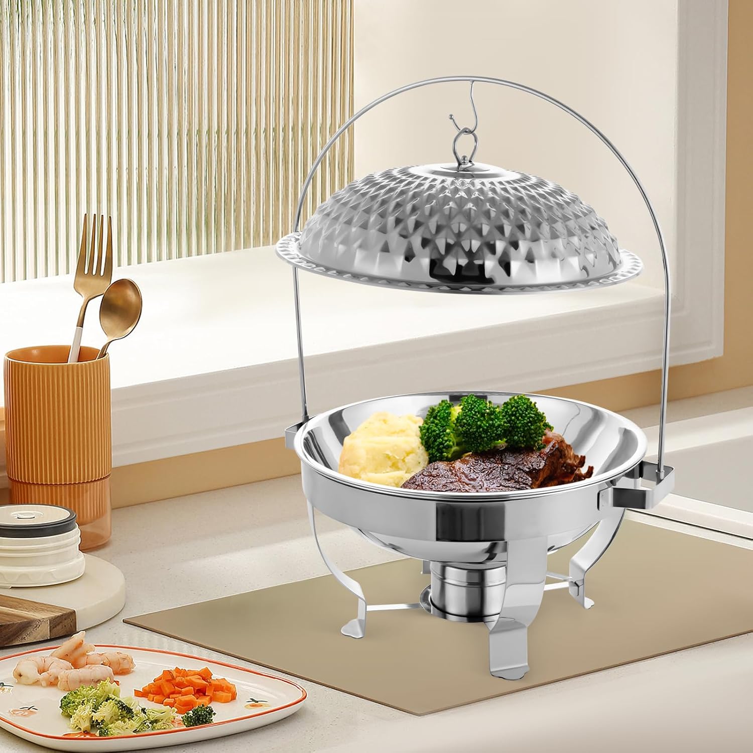 Chafing Dish Buffet Set, Stainless Steel Hanging Lid Dining Stove, Roll Top Chafing Dish Buffet Diamond-Shaped Lid and Round Stand for Buffet Restaurants and Banquets (Silver, 6L/6.3QT)