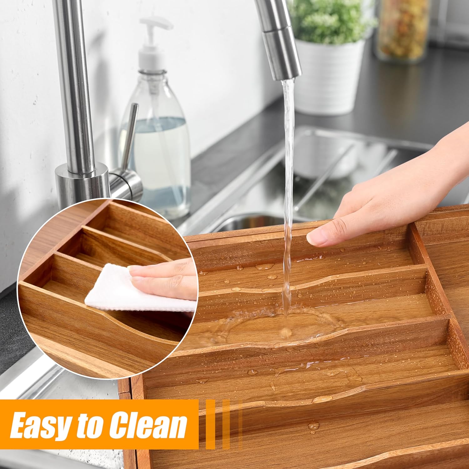 - â ăExpandable - fit most kitchen drawers.ăOur large utensil silverware drawer organizer flatware cutlery tray are adjustable in width, expanding from 17"x13" to 17"x19.6" as needed, with a depth of 1.9" . The utensil silverware drawer organizer is crafted from natural bamboo that has been grown for over 4 years. Each silverware drawer organizer made of bamboo is meticulously handcrafted by seasoned artisans to ensure a smooth, splinter-free surface. You can confidently allow your family or children to use our silverware drawer organizer.