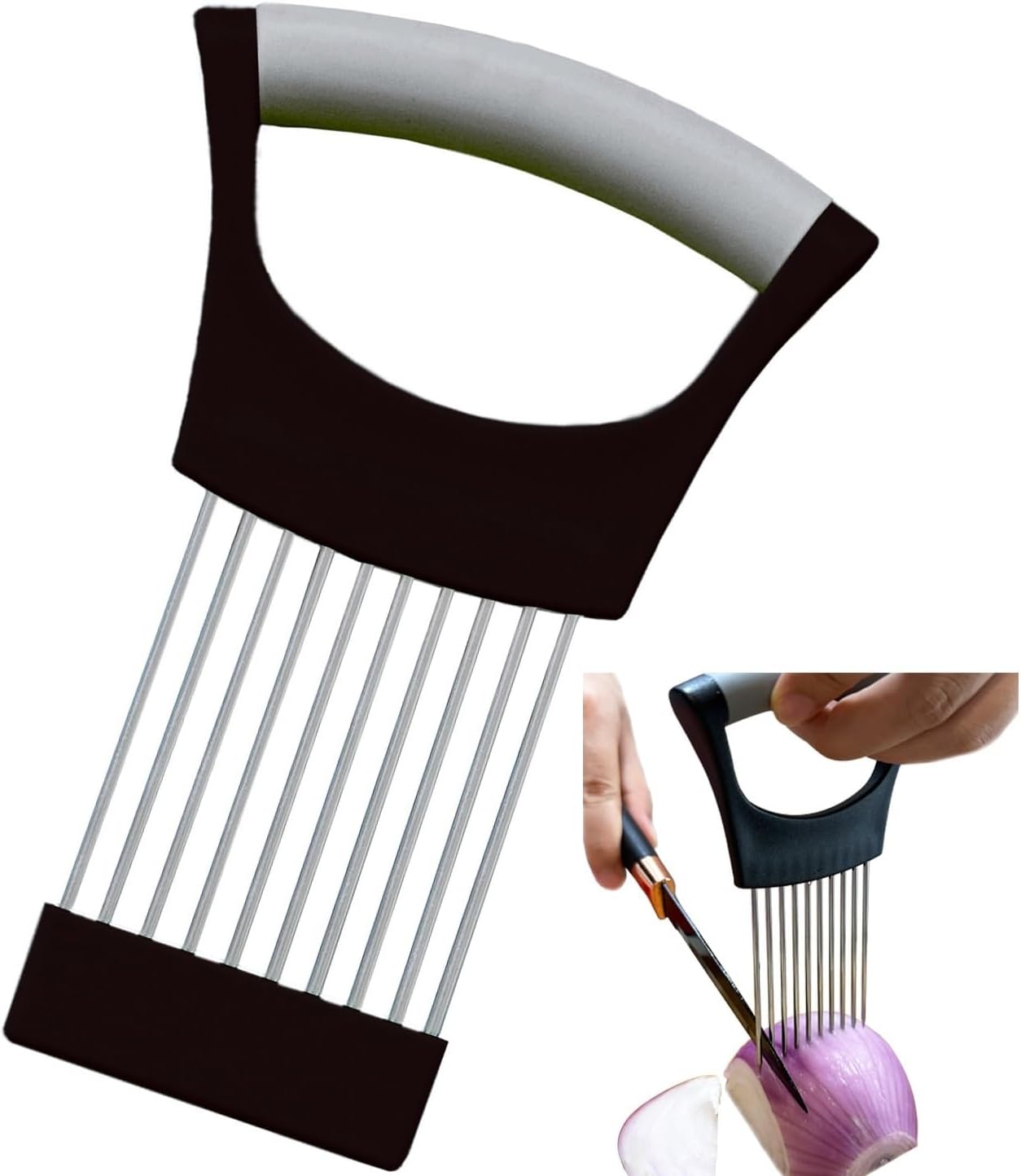 - Safe and Easy To Use:With this onion cutter assistant tool, you can easily slice without touching the food and never have the onion/fish smell on your hands again.When you hold hot meat for slicing, your fingers won't burn and the meat won't slide around.It always keeps your fingers away from the knife and makes cutting neat slices a breeze.Save time and improve your cooking skills.