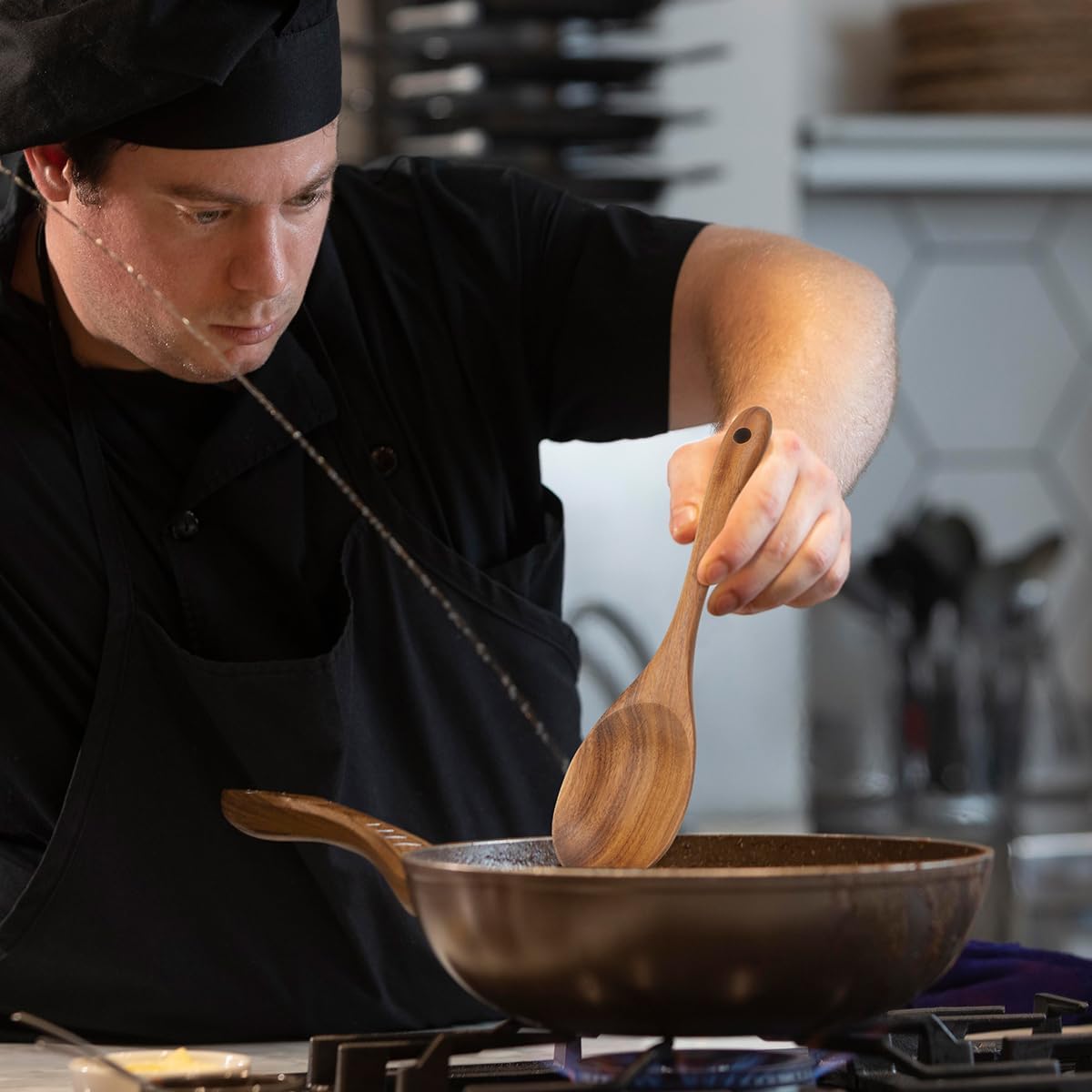- PACKAGE INCLUDES: 2 x TEAK WOOD SPOON; Specification: 10.23 x 2.67 Inches (26 x 6.8 cm); 144 gram. Wood Spoons set of 2, ideal for salad serving and cooking, as well as ingredients flipping and sauces stirring with perfect convenience.
