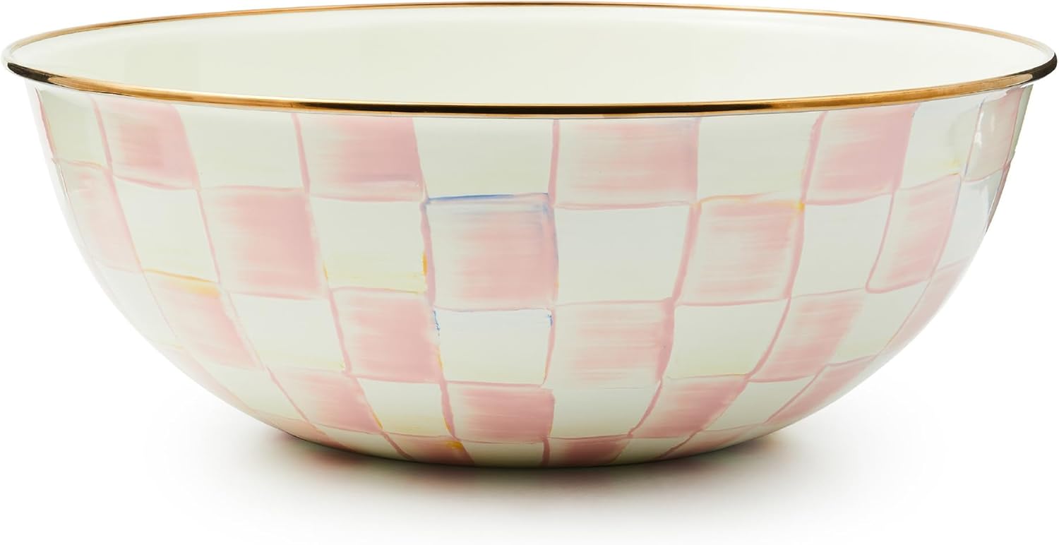 MACKENZIE-CHILDS Enamel Everyday Bowl, Serving Bowl for Entertaining, Extra-Large, Pink-and-White Rosy Check, Set of 1