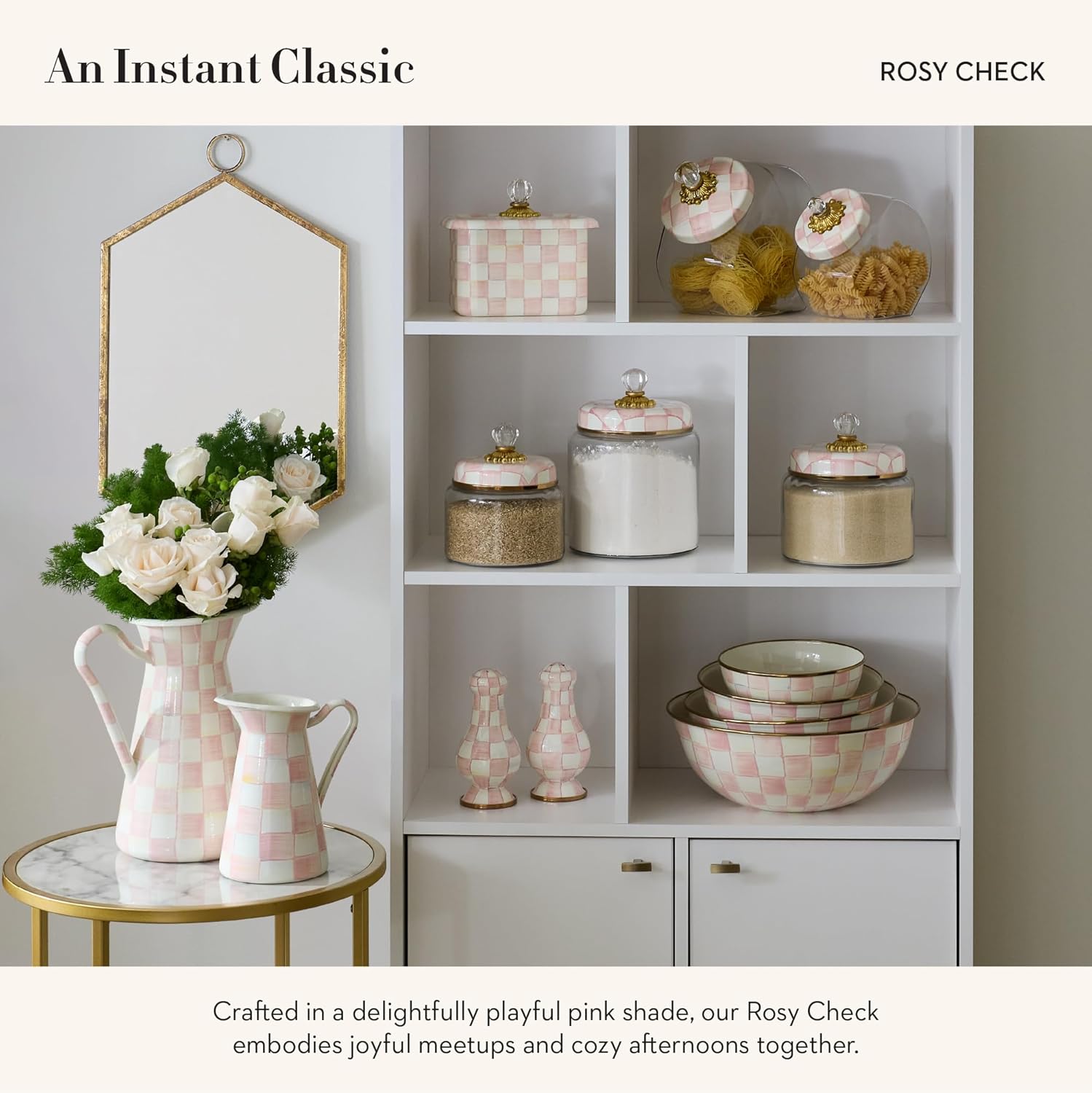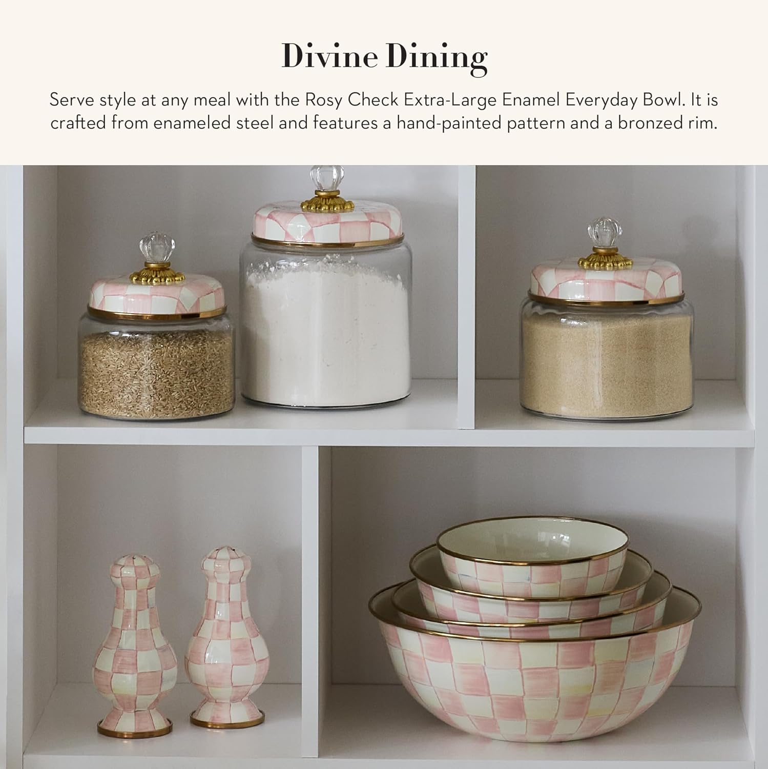 - ELEGANT ESSENTIAL: Elevate any meal with this decorative bowl. It has a hand-glazed heavy-gauge steel underbody and a bronzed stainless-steel rim and is decorated with hand-painted pink-and-white checks.