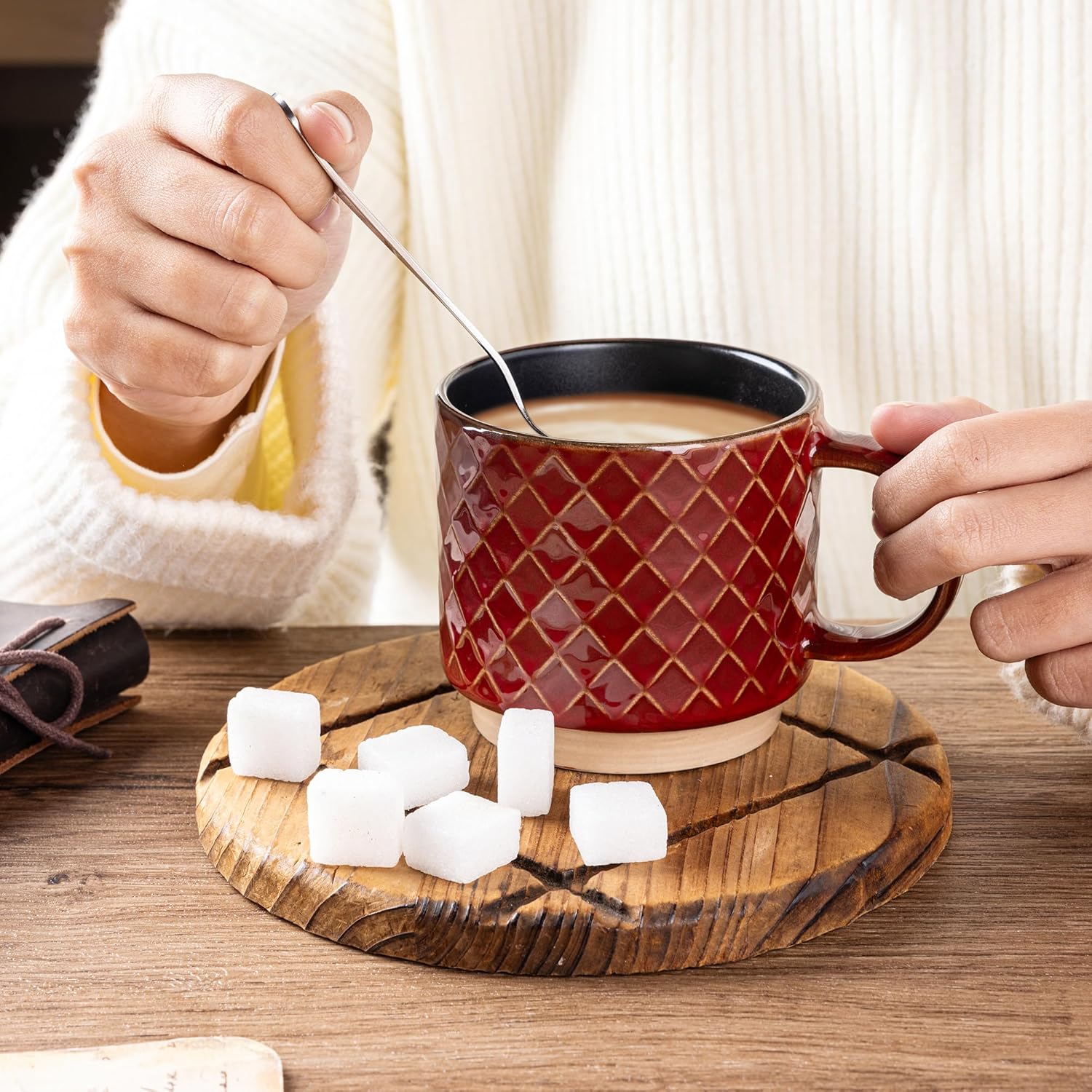 GBHOME 12 OZ Stackable Coffee Mugs, Ceramic Coffee Cups with Texture Patterns for Man,Woman,Dad,Mom, Modern Coffee Mugs Set of 4 for Latte/Cappuccino/Cocoa. Dishwasher&Microwave Safe, Red