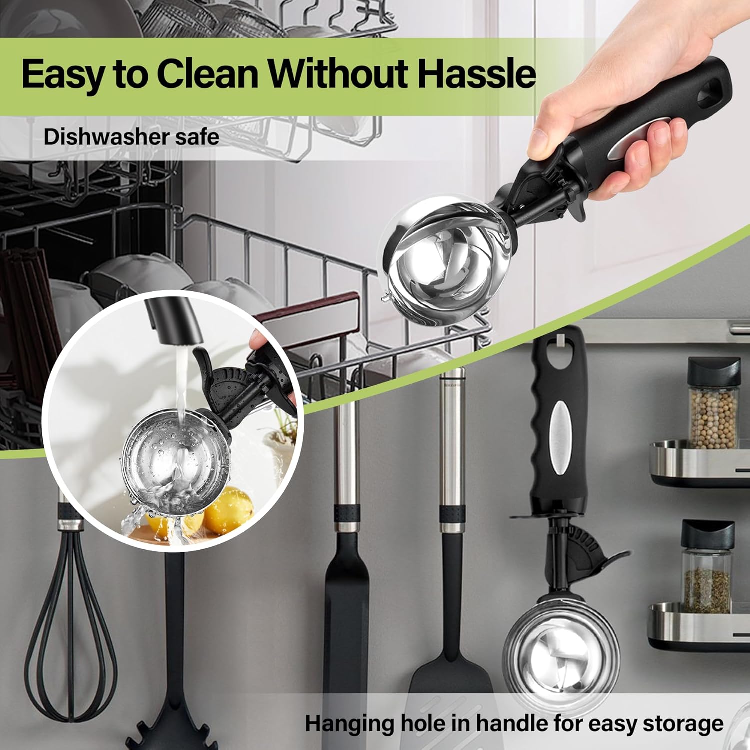 - 6 Tbsp Ice Cream Scoop for More Uniform Food Portioning- Capacity (6 Tbsp,3 oz, 90ml), spoon with internal scraping strip design, which can scrape the food clean and non stuck ball. Also easy to clean, after use can be rinsed with water or put it into the dishwasher is no problem!