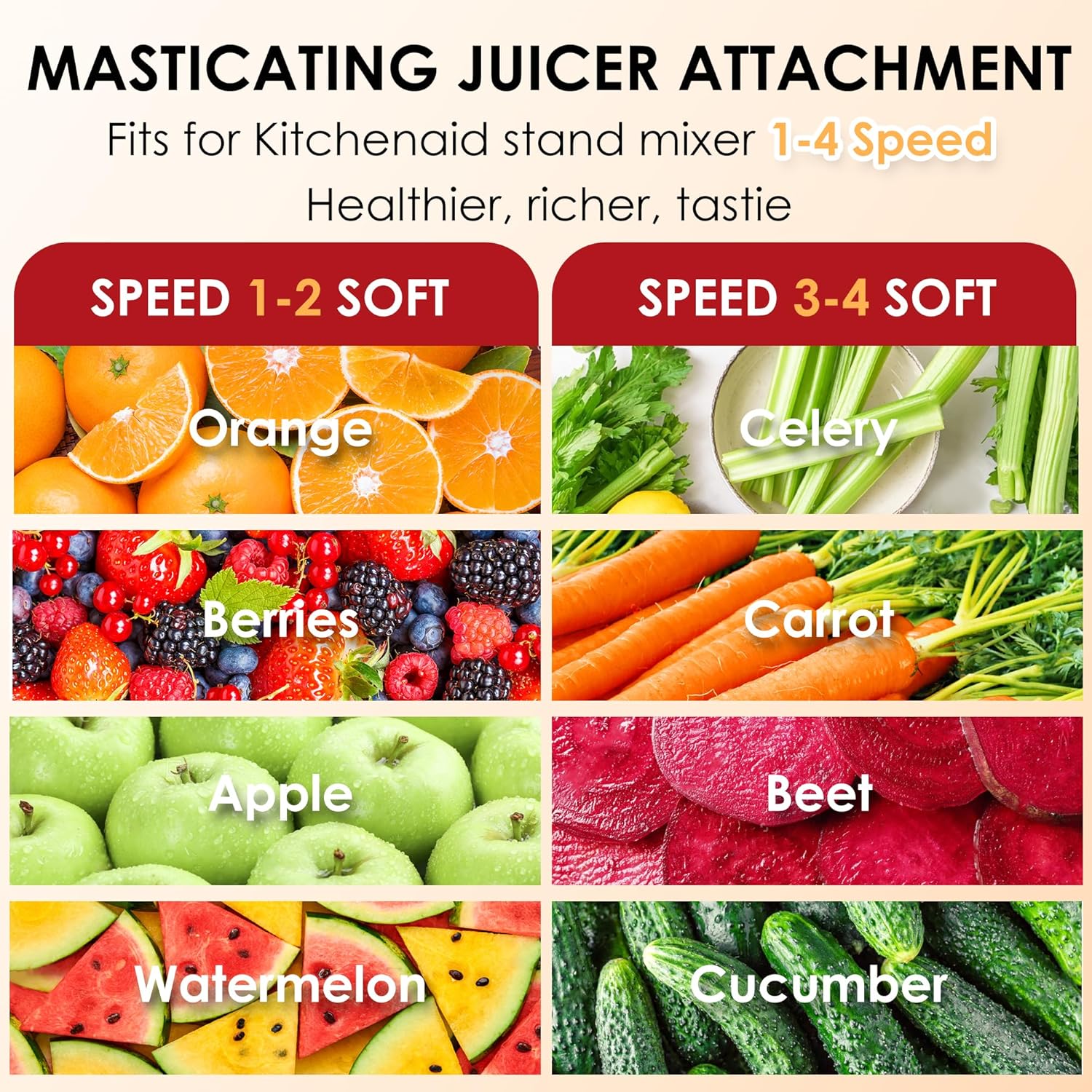 - UPGRADED Juicer Attachment: The juicer machines for kitchen Aid mixer attachments crafted from high-quality plastics and precision engineering, featuring enhanced Auger Technology and Low-Speed Cold Press Technology, increases juice yield by 30%. It ensures durability and long-lasting performance, delivering an exceptional juicing experience.