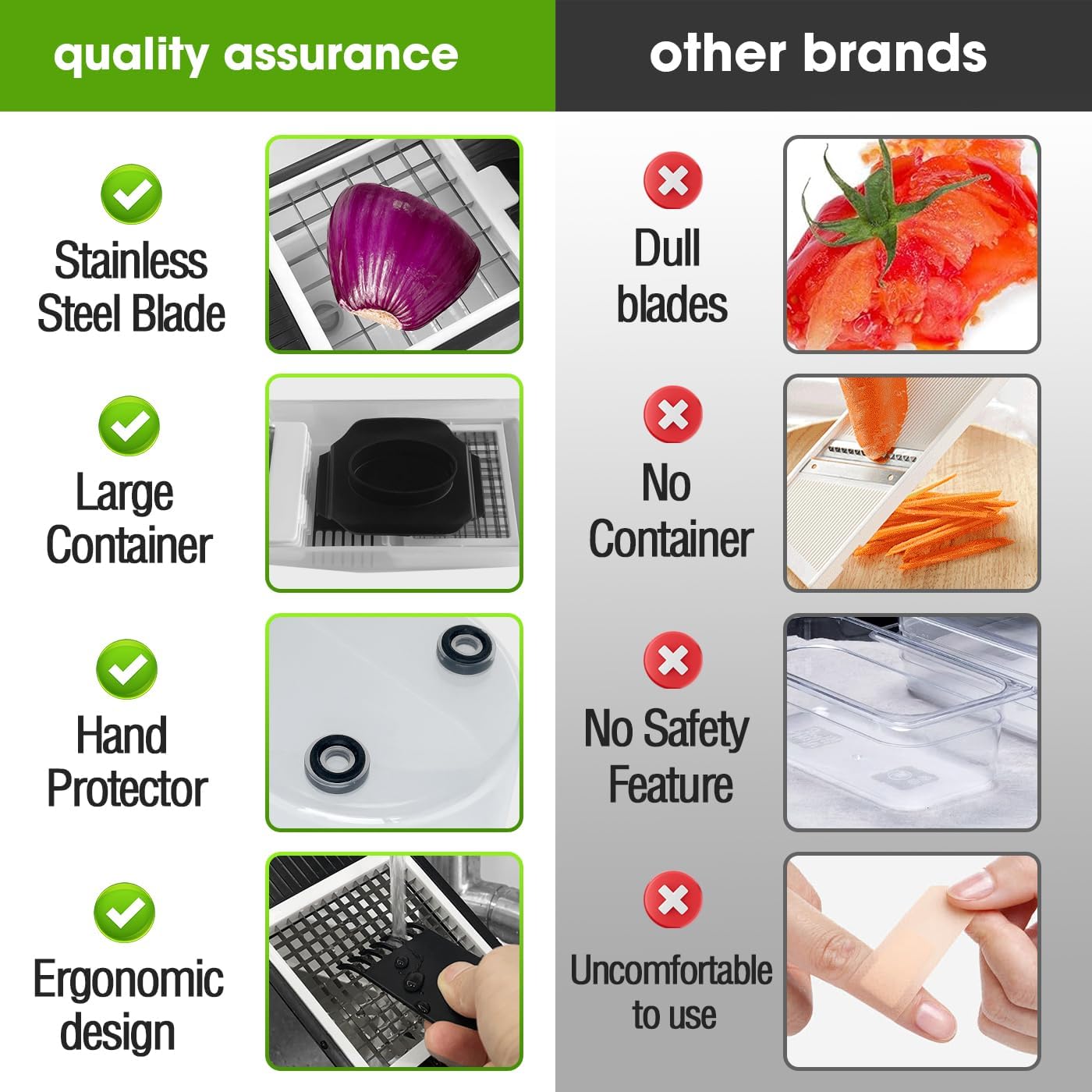 - Easy pre-meal preparation - Our vegetable cutter is a must-have tool in the kitchen. Everyone wants to eat healthier, but doesn't have much free time. Our cutters cut potatoes, tomatoes, cucumbers, carrots, etc., into small pieces with a strong, rust-proof blade. The stainless steel blade keeps the razor sharp, making the dicing crisper and smoother.