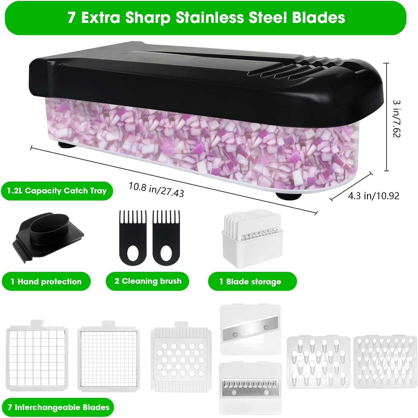 - High quality & great value - The Vegetable chopper has the function of mandolin slicer and cheese grater, and excellent quality. It includes 7 blades, 2 cleaning brush, 1 finger guard, and a 1.2L container for safe and efficient meal prepping.