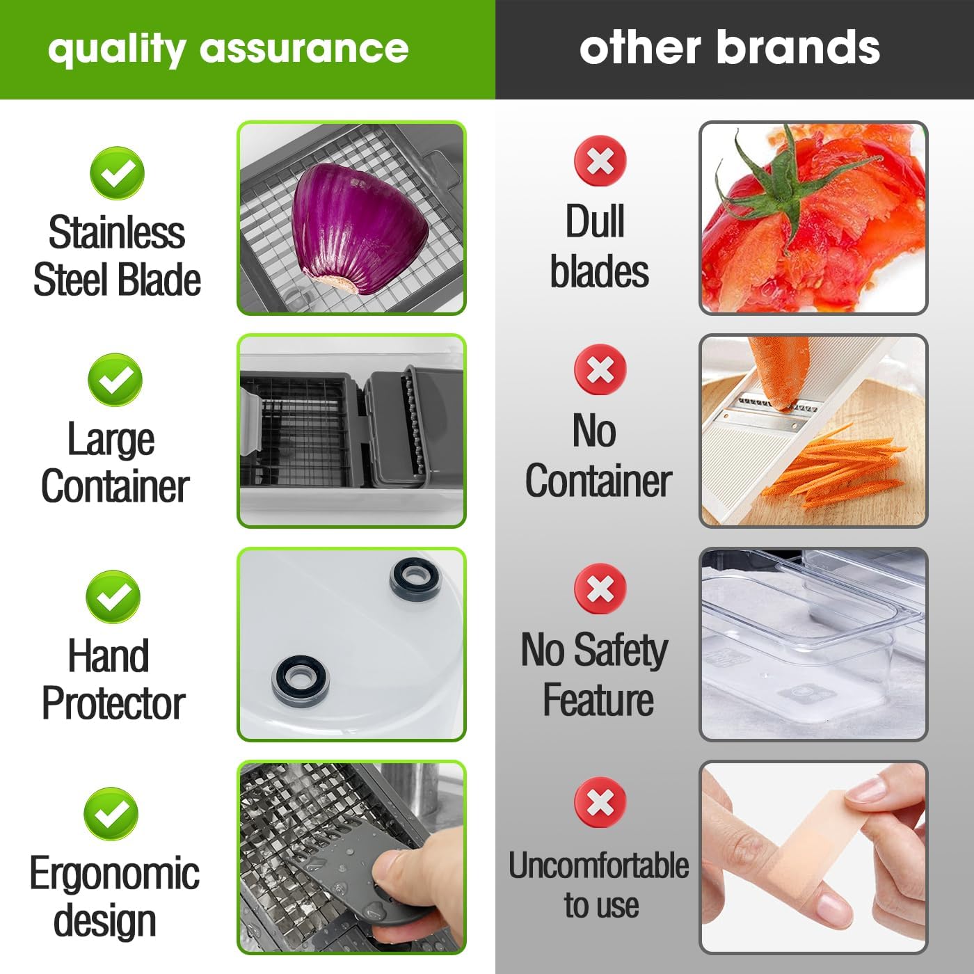 - Easy pre-meal preparation - Our vegetable cutter is a must-have tool in the kitchen. Everyone wants to eat healthier, but doesn't have much free time. Our cutters cut potatoes, tomatoes, cucumbers, carrots, etc., into small pieces with a strong, rust-proof blade. The stainless steel blade keeps the razor sharp, making the dicing crisper and smoother.