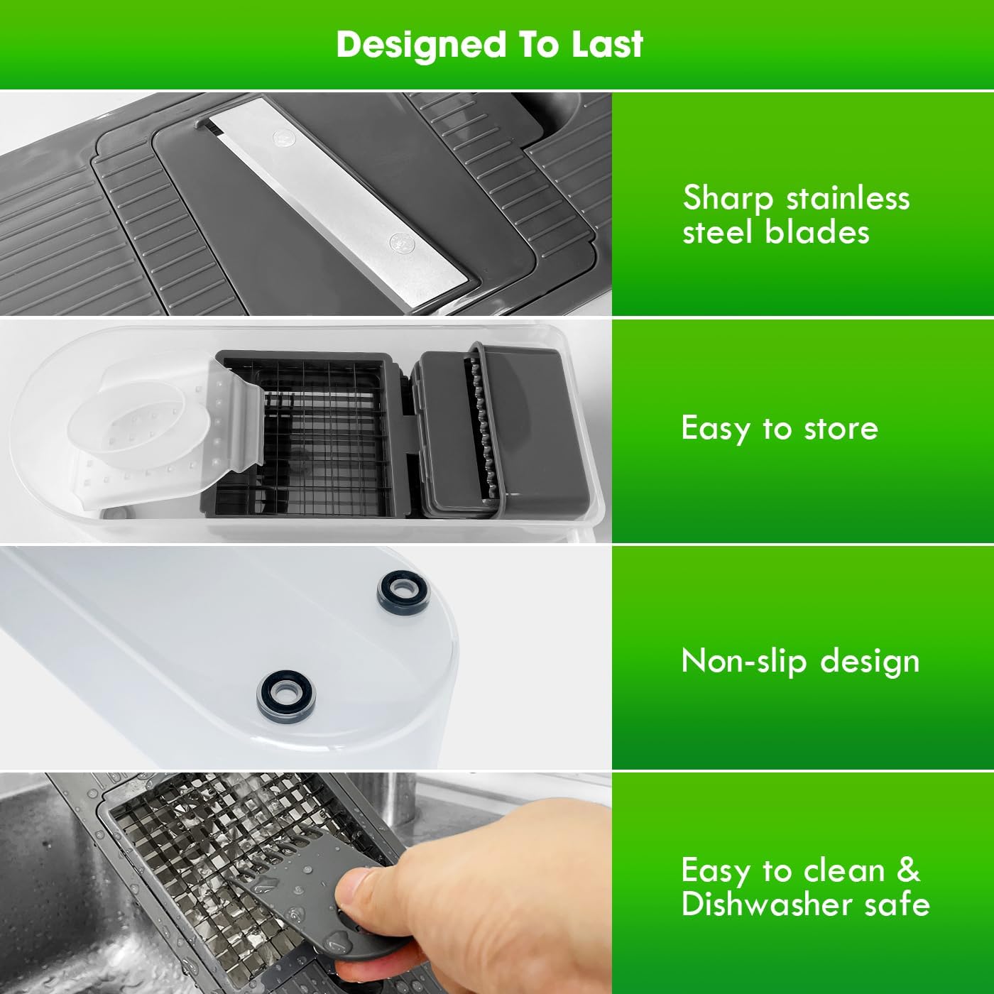 - Easy to clean, dishwasher-safe - Choosing the right kitchen kools makes your life easier - our vegetable slicers, dicer, shredders are quick and easy to clean, and dishwasher-safe. The top cover is completely removable, can be thoroughly cleaned under running water, and comes with two cleaning brushes. Easily solve your kitchen chores.