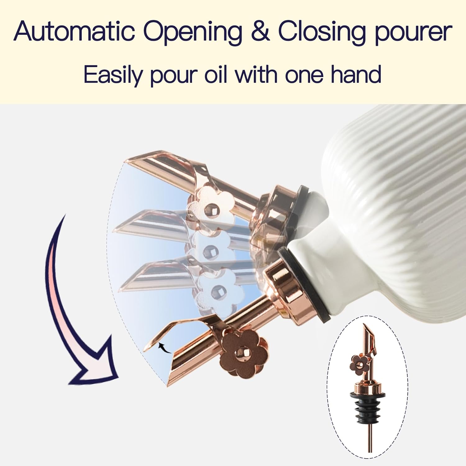- Automatic Pouring and No Drips: Our olive oil dispenser features a carefully designed spout that opens automatically when tilted and closes seamlessly when placed vertically, eliminating the need to manually maneuver the bottles and preventing dripping or spilling.