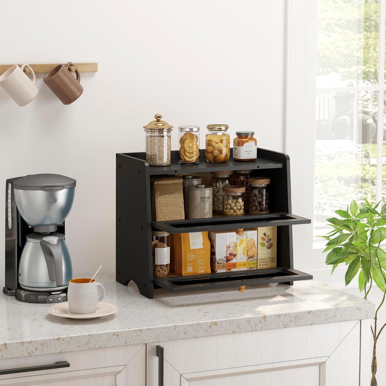 Double Layer Bread Box for Kitchen Countertop, Large Breadbox Bread with Windows, Wooden Farmhouse Bread Holder (Black)